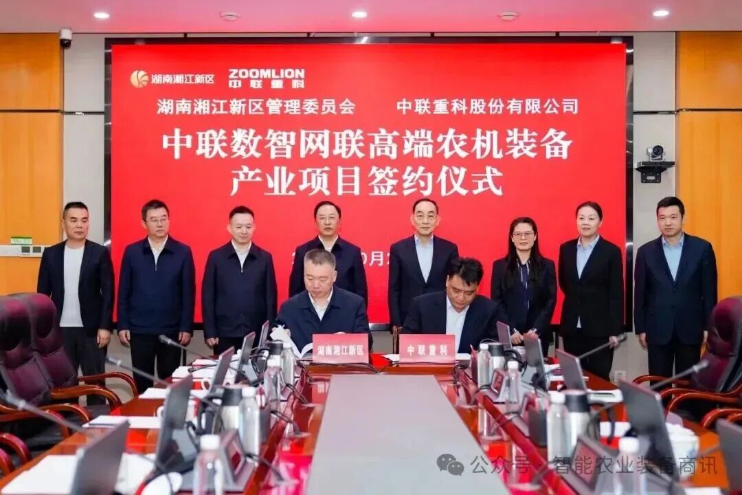 近日,中联数智网联高端农机装备产业项目签约仪式在湖南湘江新区举行。 ▲签约仪式现场 中联数智网联高端农机装备产业项目落户湖南湘江新区,是中联重科在农业机械领域的关键布局。该项目位于湖南湘江新区黄桥大道以西、雪松路以南,占地面积约1500亩,总投资额约95亿元。项目建设涵盖高端农机整机装备以及材料、结构、电气、液压、传动、新能源等零部件的研发制造基地,打造“国内领先、国际一流”的高端农机装备及成套新型重要零部件“灯塔工厂”。这不仅将为中联重科农业机械引领高端化、绿色化、智能化发展铸造坚实根基,也将为湖南打造世界级高端农机装备产业集群增添强劲动能。 据了解,农业机械是中联重科重要战略新兴板块之一,已经拥有拖拉机、小麦机、玉米机、水稻机、烘干设备、丘陵山地动力平台等11大系列120余款主销产品,成功打造了全球最大马力轮式拖拉机、国产最大喂入量谷物收获机、无人智能驾驶插秧机等一系列高端、智能、绿色农机产品和一批补短板农机产品,还通过智能农机与数字农业相结合,打造智慧农业新模式。近年来,中联重科农业机械销售规模高速增长,以强大产品与技术优势,助力中国农业高效高质量发展。