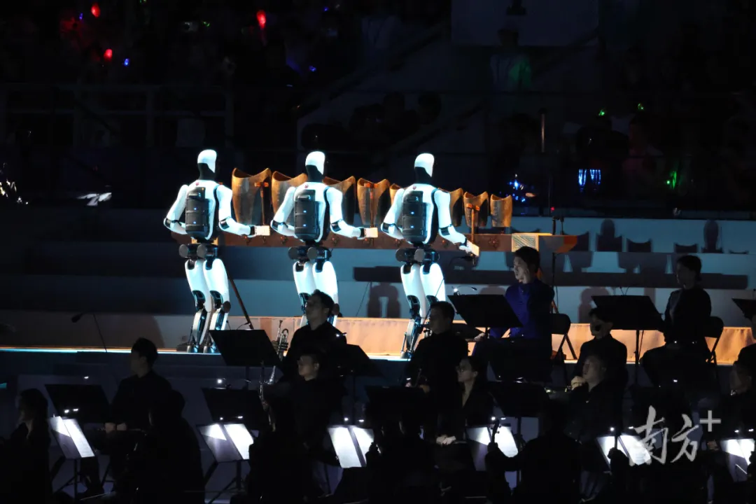 02 开幕重构 从“人机协作”到“文明对话” 11月9日晚的全运会开幕式上,数智元素成为最大亮点之一。三台优必选全自主具身智能人形机器人Walker S2代表粤港澳三地,手持击槌敲响广州南越王墓出土的8件青铜句鑃,奏响广东音乐经典《彩云追月》,正式拉开赛事大幕。 机器人精准的动作、与古典乐器的巧妙配合,不仅展现了我国人形机器人技术的顶尖水平,更以“数智+古典”的创意形式,凸显了粤港澳大湾区的科技实力与文化底蕴,成为全运会开幕式上令人难忘的科技名片。