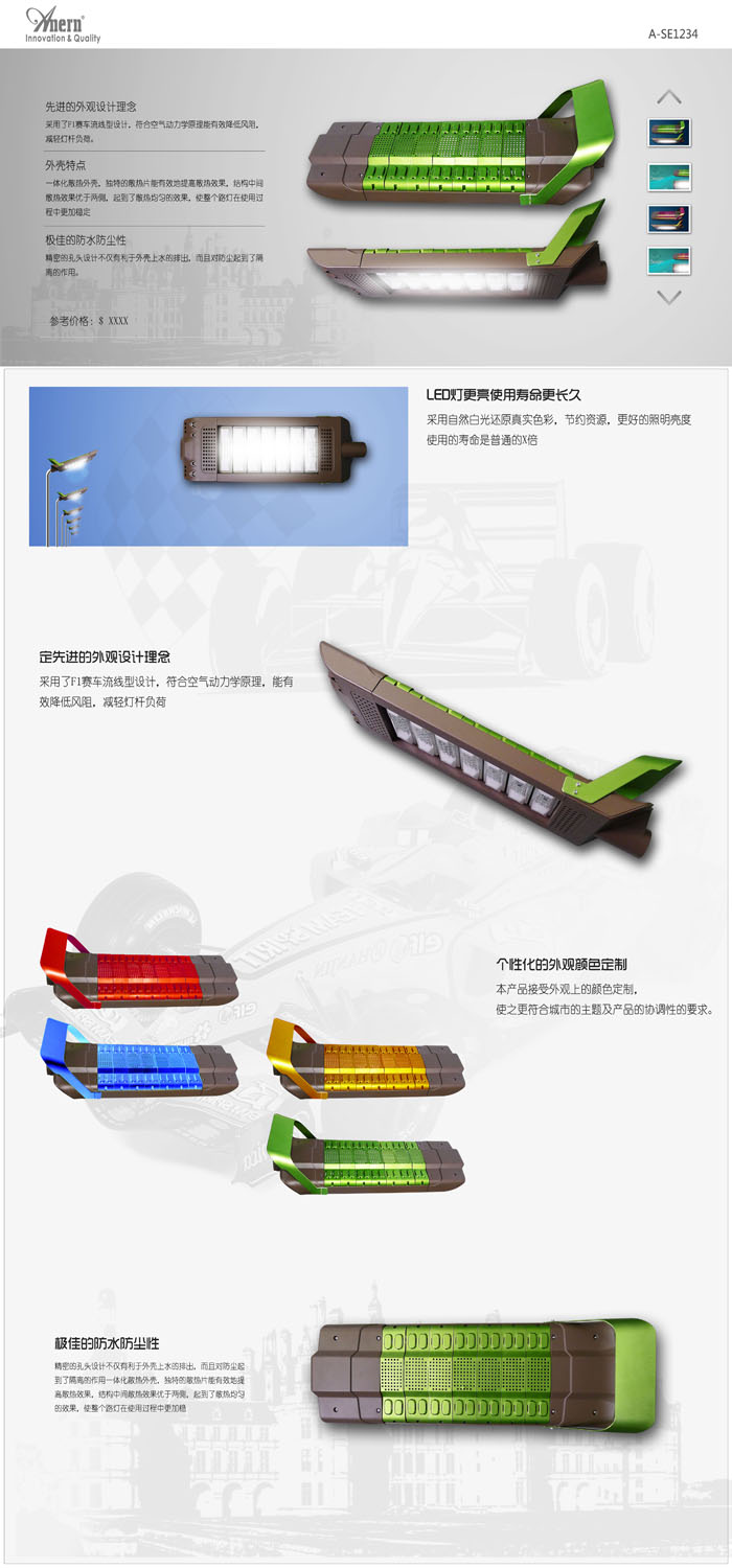 1. 先进的外观设计理念:采用了F1赛车流线型设计,符合空气动力学原理,能有效降低风阻,减轻灯杆负荷