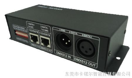 产品通过XLR-3接口或RJ45接口与DMX512(1990)数码控制台相连接,能够接收DMX控制信号并将其转换为PWM调光信号,以实现LED调光、混色的效果。