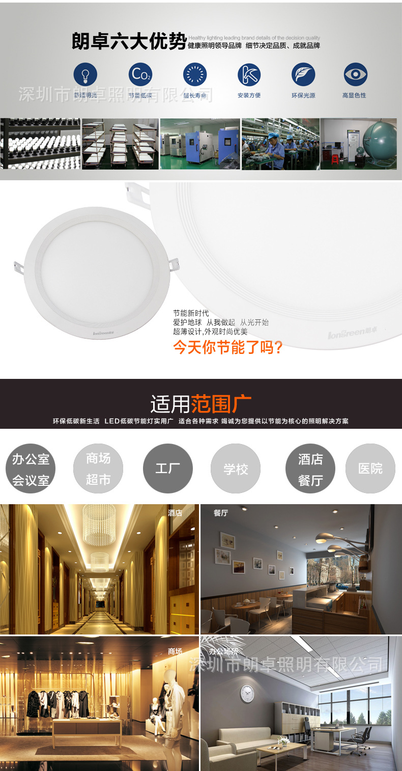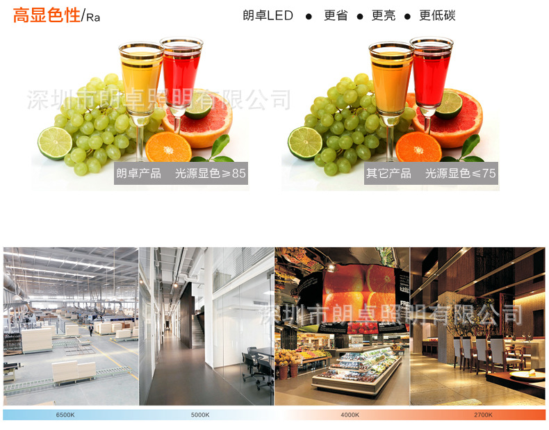 发光均匀柔和,无眩光,无频闪,明亮舒适,显色指数大于Ra80,无紫外线,健康环保