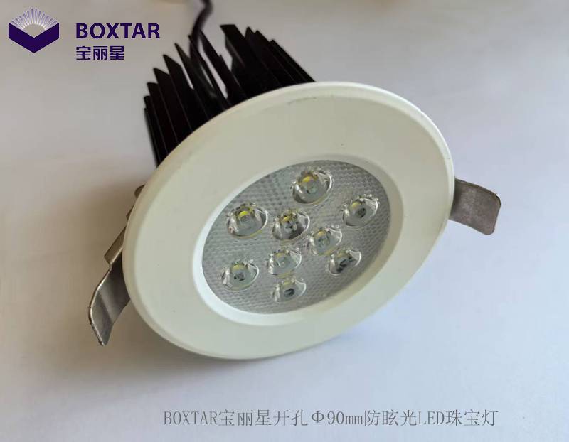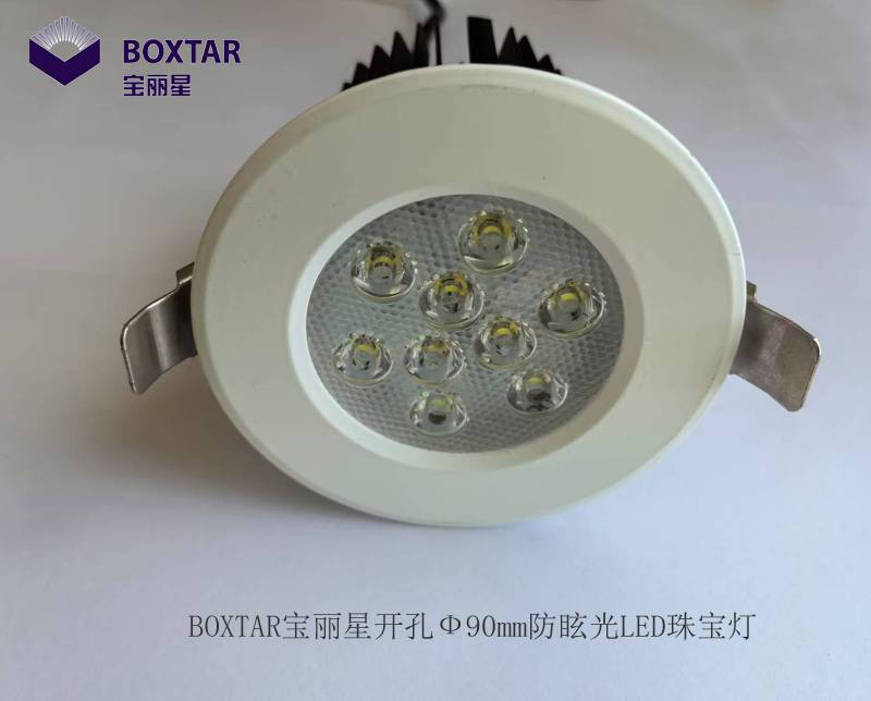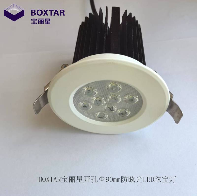 BOXTAR宝丽星开孔Ф90mmLED珠宝灯采用国际进口LED光源,以及自主研发设计的高效LED珠宝灯驱动,配置光学级透镜、高导系数散热体、铝合金外壳、缔造出的珠宝灯光让您的黄金、彩宝、钻石、铂金、发晶、水晶、白玉、珍珠、银饰、翡翠、碧玺、玛瑙等珠宝首饰展示得精美绝伦,绚烂夺目。
