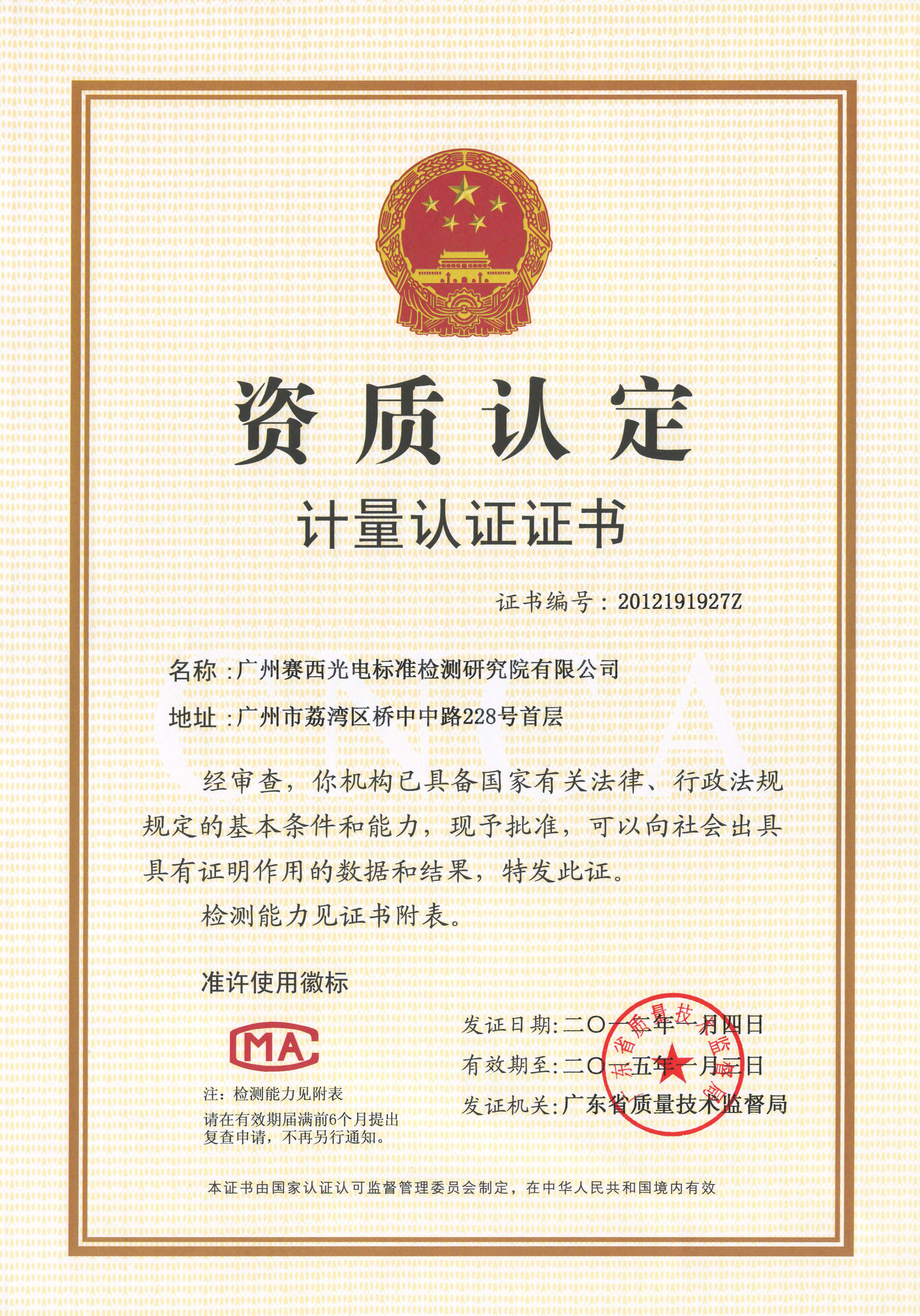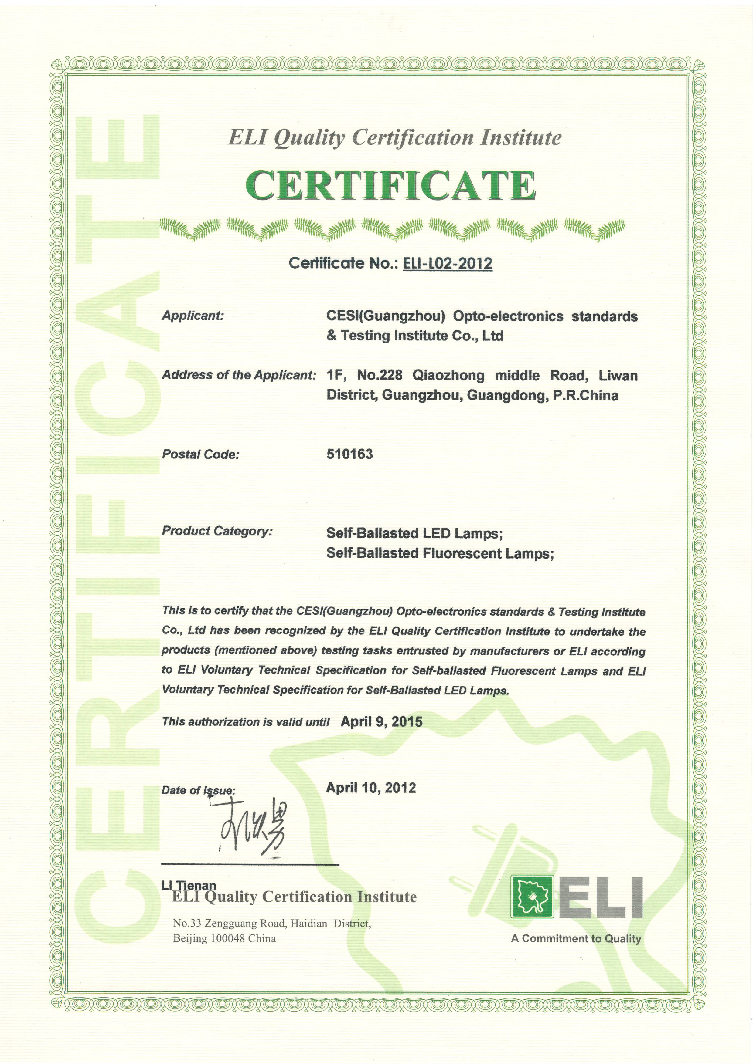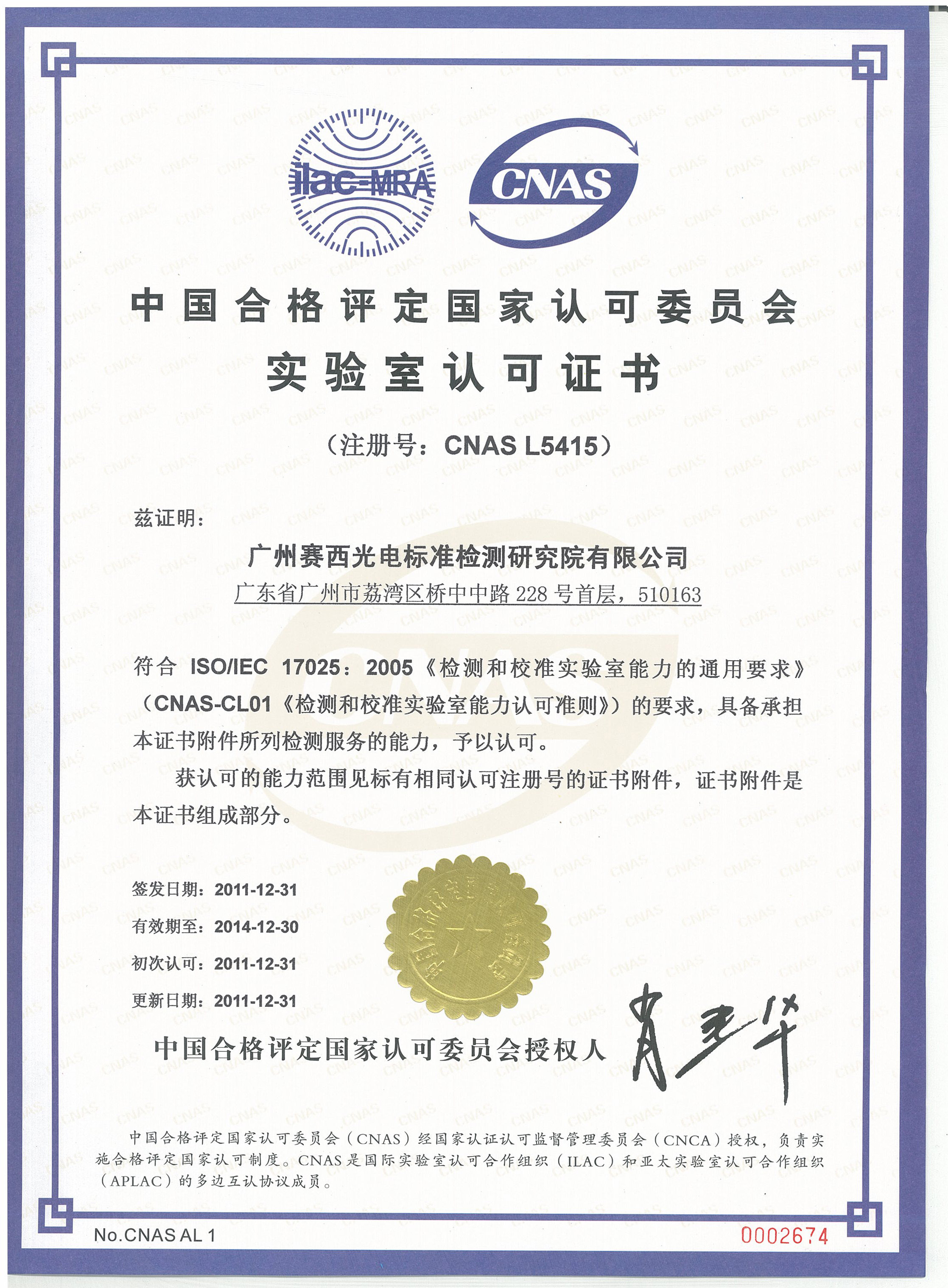赛西(CESI)是国际电工委员会电工产品合格与认证组织(IECEE)认可的CB实验室、美国保险商实验室(UL)认可的第三方数据交换(TPTDP)实验室、美国联邦通信委员会(FCC)认可注册的电磁兼容实验室、挪威NEMKO认可实验室、ZigBee认可实验室、中国合格评定国家认可委员会(CNAS)认可实验室、计量认证(CMA)认可实验室、美国环保署(EPA)认可的固态照明(SSL)能源之星实验室、T?V Rheinland认可的TMP实验室、全球高效照明产品认证(ELI)认可实验室、广东省LED照明标杆体系指定实验室、LED照明标准光组件检测全权公共实验室等。
