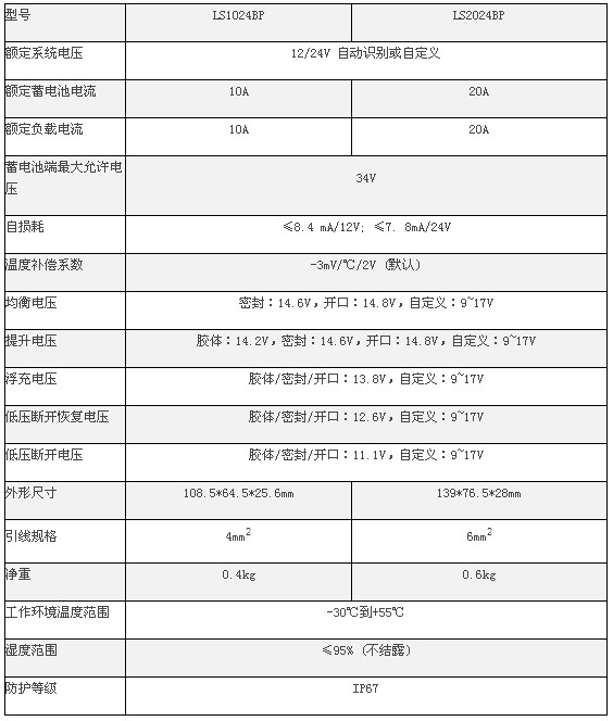 LS-BP系列太阳能防水控制器,采用最先进的数字技术设计,全自动运行。适用于对环境要求较高的太阳能离网系统中,主要应用于负载长期需要供电或负载需要光控,时间控制或光控与时间相结合自动控制开关的系统,如:(家庭用)供电系统,野外的自动检测设备,交通指示灯、太阳能路灯、庭院灯系统等。