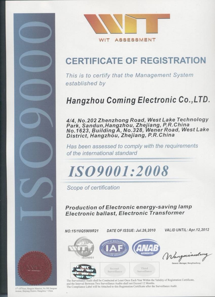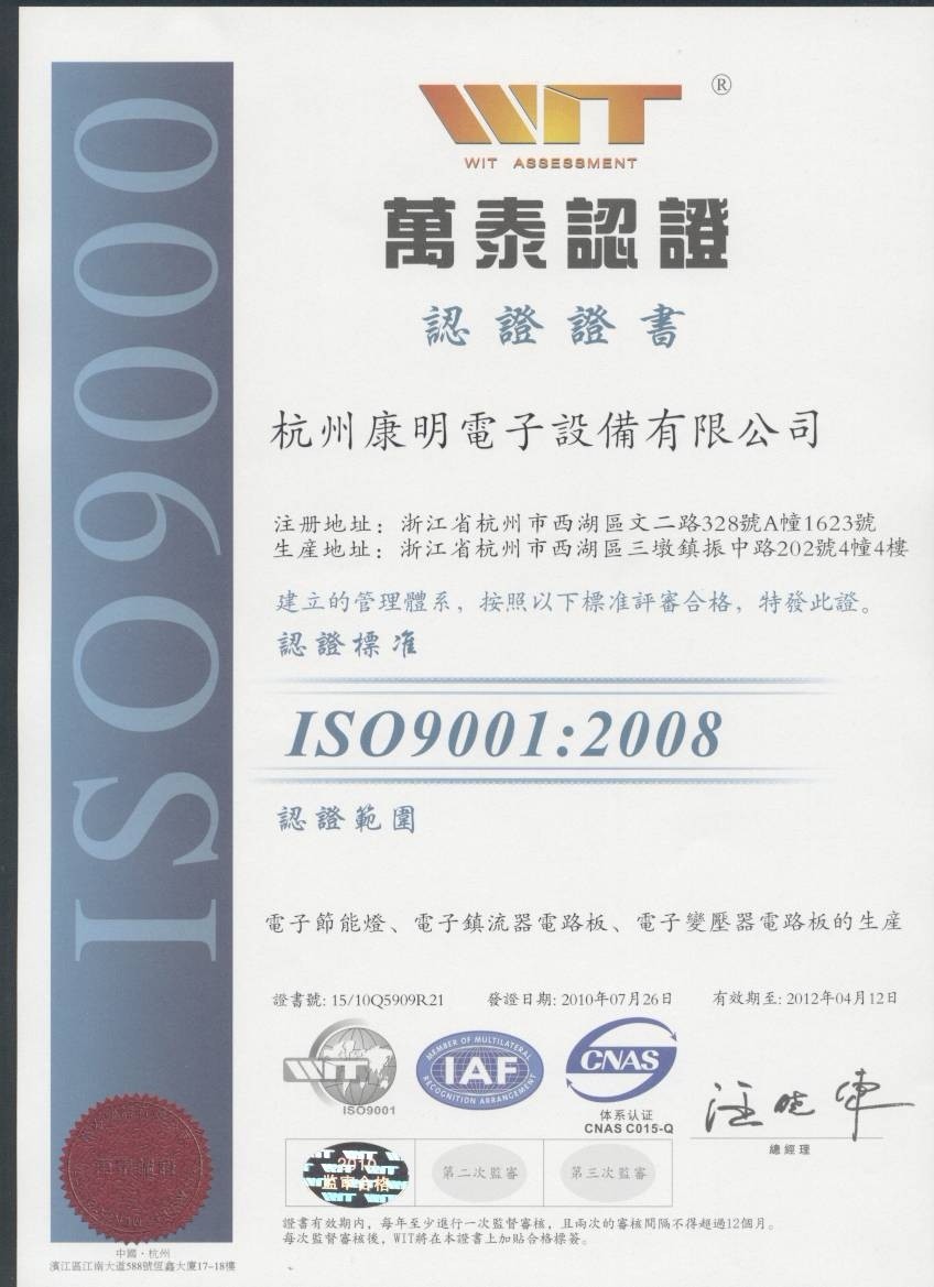 杭州康明电子设备有限公司成立于2000年6月,有多项专利和省级高新项目成果,公司主要研发和生产电光源产品及其控制设备,包括HID、荧光灯、调光电子镇流器,电子变压器,LED驱动器、LED灯,一体化CDM灯具,节能灯,应急灯和太阳能照明控制器等。我们的多项产品拥有CE、UL认证证书,公司于2002年10月通过了ISO9001-2000认证。公司拥有专业的技术人员队伍,优秀的管理人才,完善的内部培训机制和先进的管理理念。公司现有职工250人,年生产量约800万套,产品主要出口欧美等地。我们衷心的希望在OEM/ODM上成为您最好的合作伙伴。