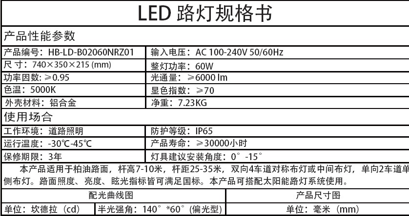 鸿博光电科技LED节能环保路灯HB-LD-B02060NRZ01
