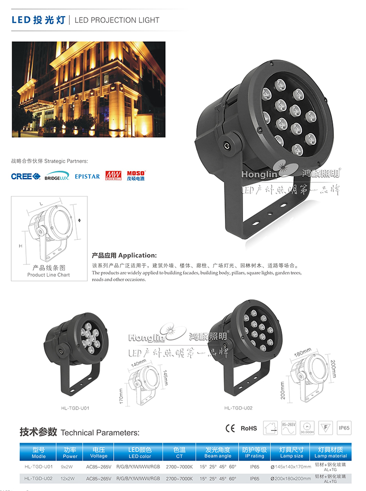 投射灯,聚光灯,散光灯,功率有3-144W,主要用于墙体外墙照明,桥梁景观亮化,酒店外墙装饰照明,雕塑投射照明,河道栏杆照明