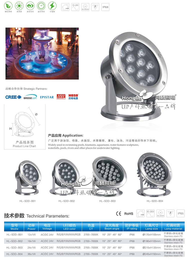 鸿麟LED水底灯采用进口大功率LED光源,灯体采用不锈钢铸造,钢化玻璃和防水硅胶密封,防护等级高达IP68,可承受10M水柱冲击,适用各式彩色控制器。可实现单色常亮效果/内控同步RGB七彩变化/外控同步RGB七彩变化。