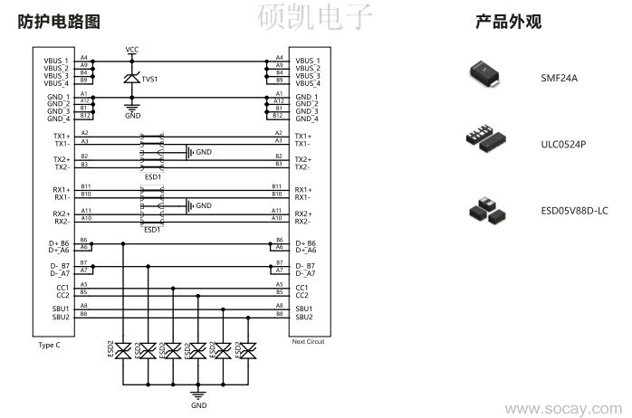 1.在Type-c接口的电源部分,用一颗大通流的TVS对地做浪涌和静电防护