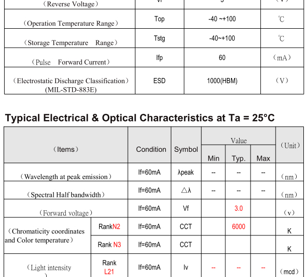 | Type | Power (w) | Dimensions (mm) | Current (mA) | Voltage (V) | Luminous Flux (Lm) | CRI (Ra) |