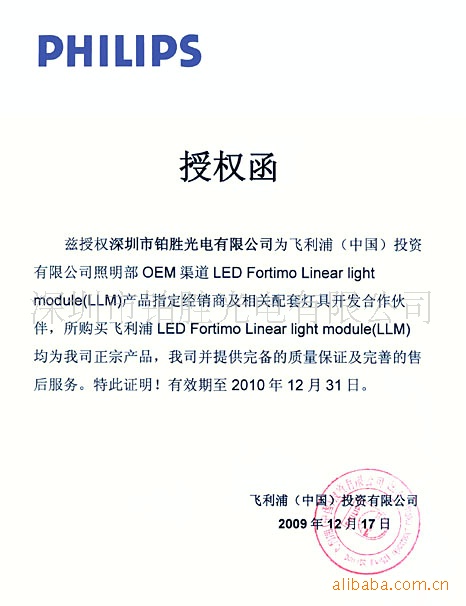 2009年铂胜光电与飞利浦公司建立了OEM战略合作伙伴关系,成为飞利浦新一代光源:科斯茂(Cosmopolis)、意利特(CDM-Elite)、LED(Fortimo LED LLM)、依柯(SON-T PIA Eco)中国大陆OEM战略合作伙伴。