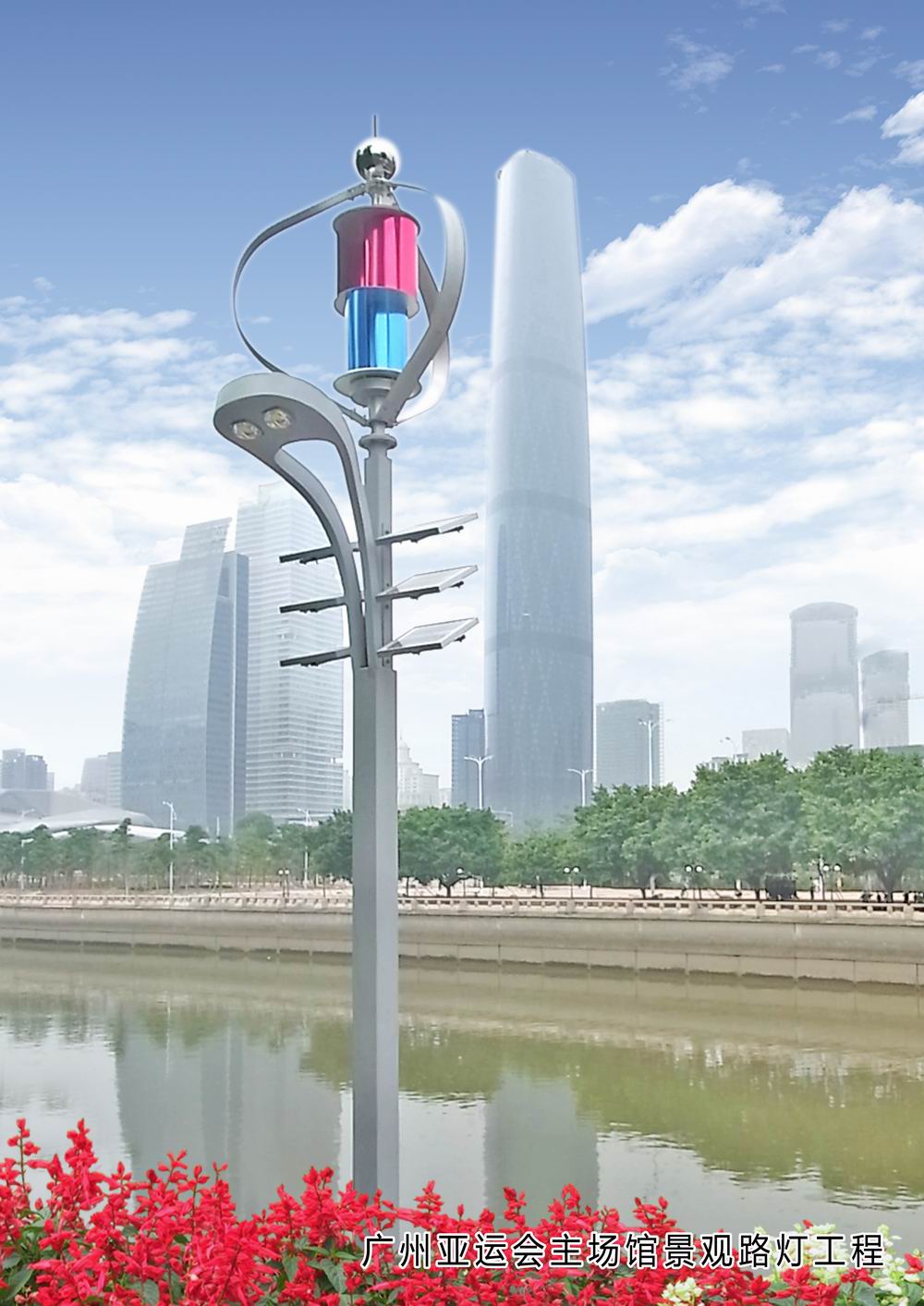 陀螺型加蓝红相衬美丽的外观,尤如中国结,红绣球,在中国传统文化中是带来好运的吉祥物,造型优美的风车沿公路排列,迎风飞舞,将成为道路的风景线。