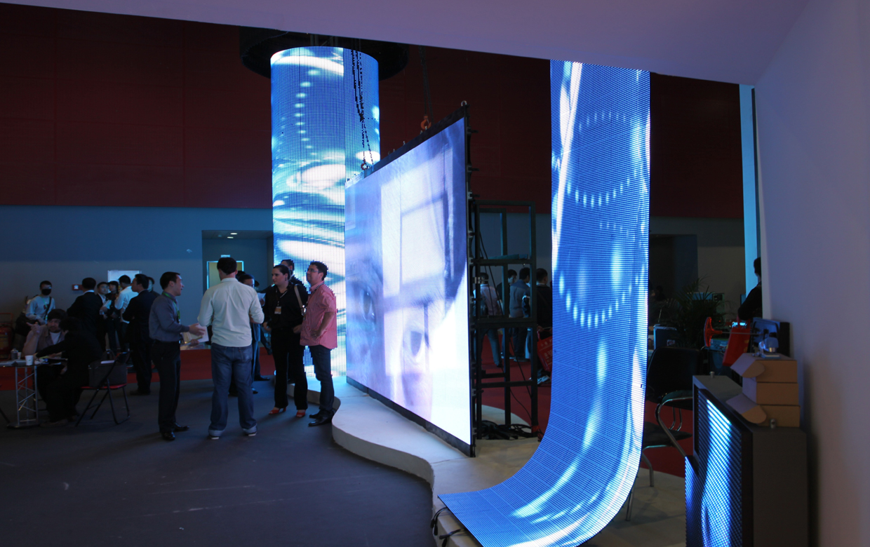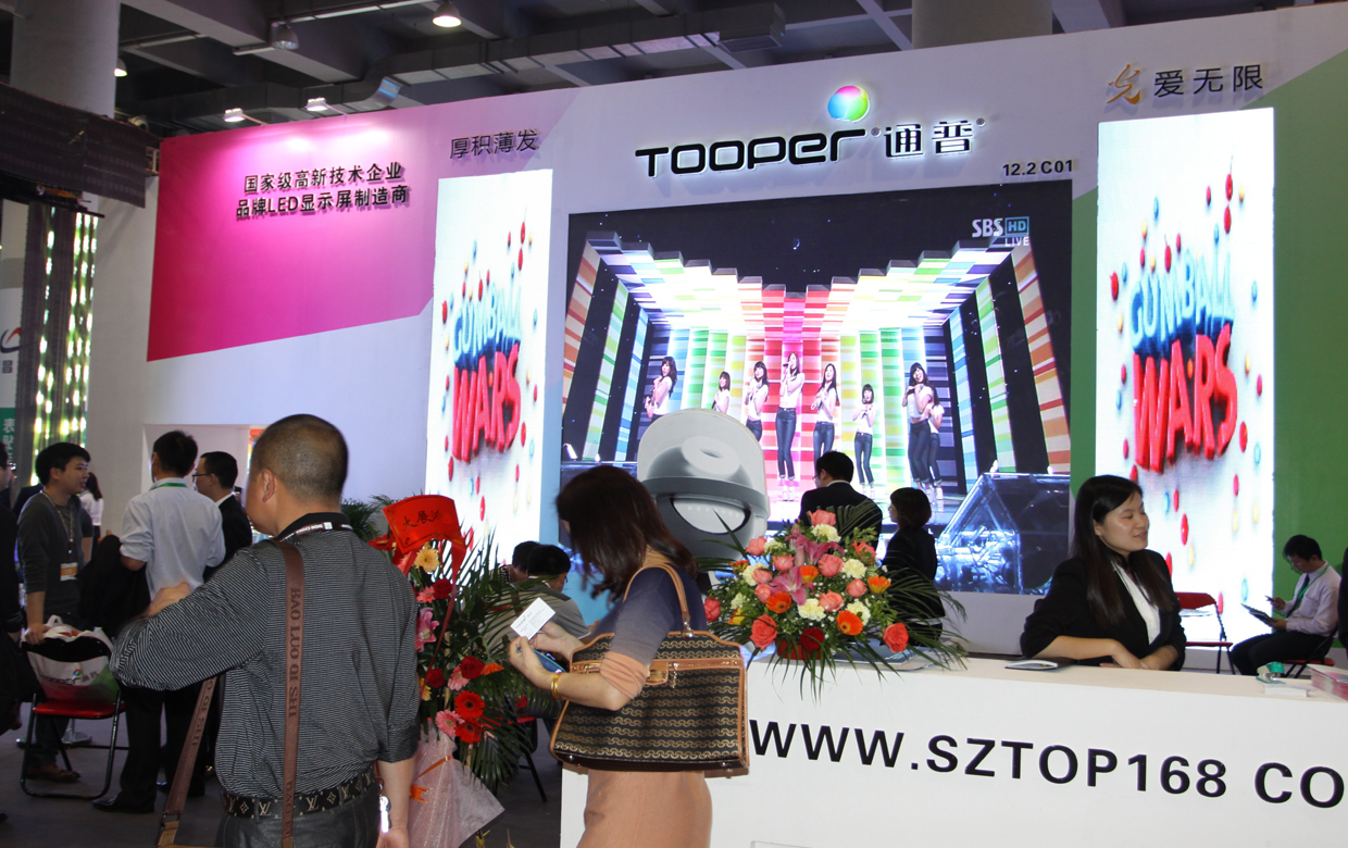 展位现场气氛热烈,人潮涌动,不少客户都对通普的LED产品表现出了浓厚的兴趣,最新300系列的可弯折幕帘式LED显示屏造型别致引人兴趣,圆柱屏画面滚动流光溢彩,501系列互动踩踏式地砖LED显示屏更是闪耀夺目。同时通普的LED照明产品也是展会的一大亮点,LED环形灯、面板灯、天花灯等照的展厅内亮如白昼,也使得客户赞不绝口。