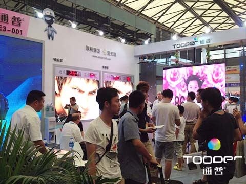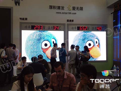 此次盛会,通普科技也不甘落后,携手自己的“秘密武器”参展并广受欢迎。据了解,此次展会,通普除了展出P10软幕、P18.75弧形屏、压铸铝箱体P5.33室内高清LED显示屏等主打热卖产品之外,还推出最新研发的高效节能屏。这款产品,充分考虑到市场对显示屏节能减排的需求,平均至少可降低能耗50%,最高达70%,在保证低电耗低发热的同时,还充分保证了显示屏的清晰度。