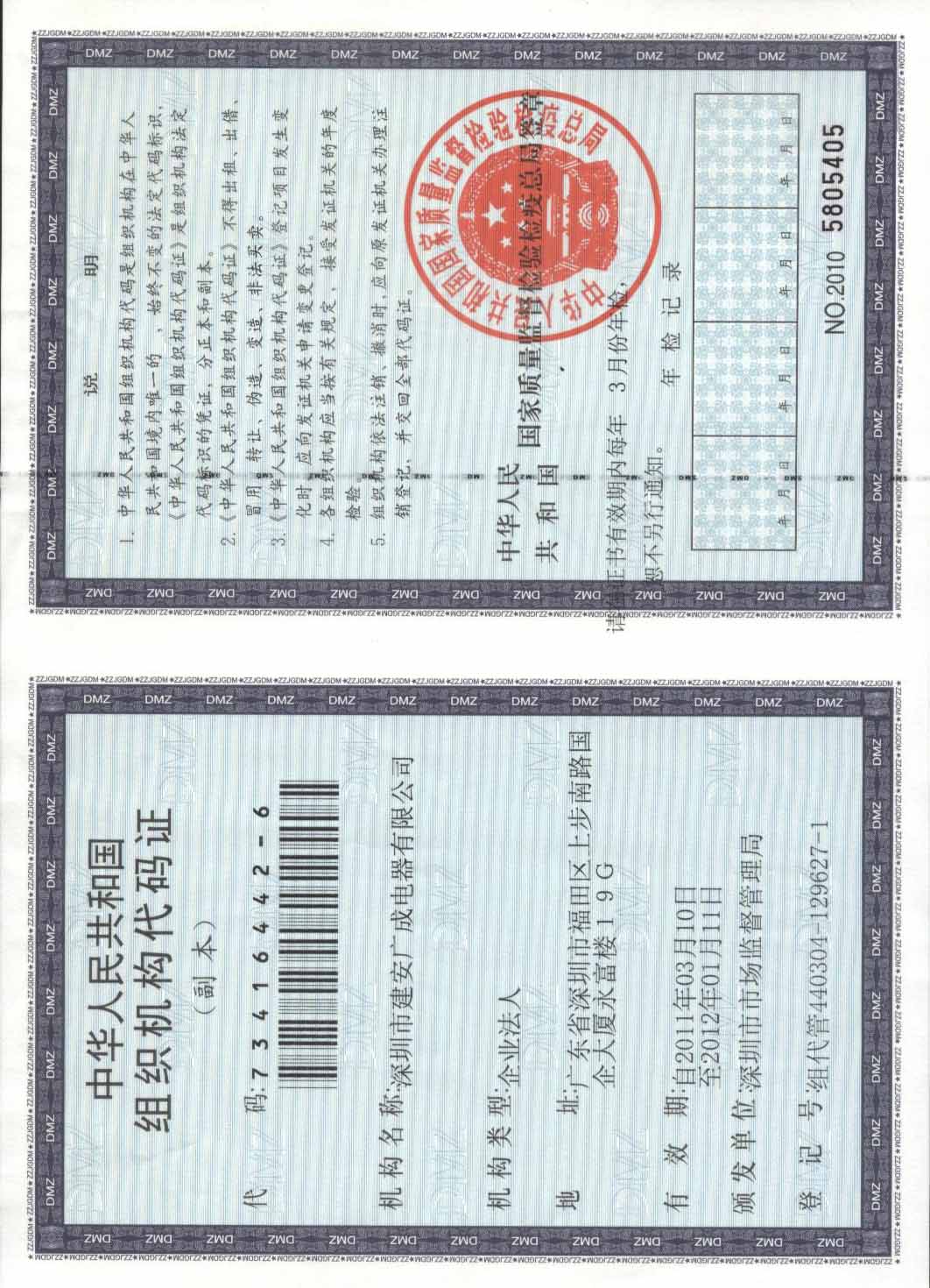 发证机构:深圳市质量监督管理局