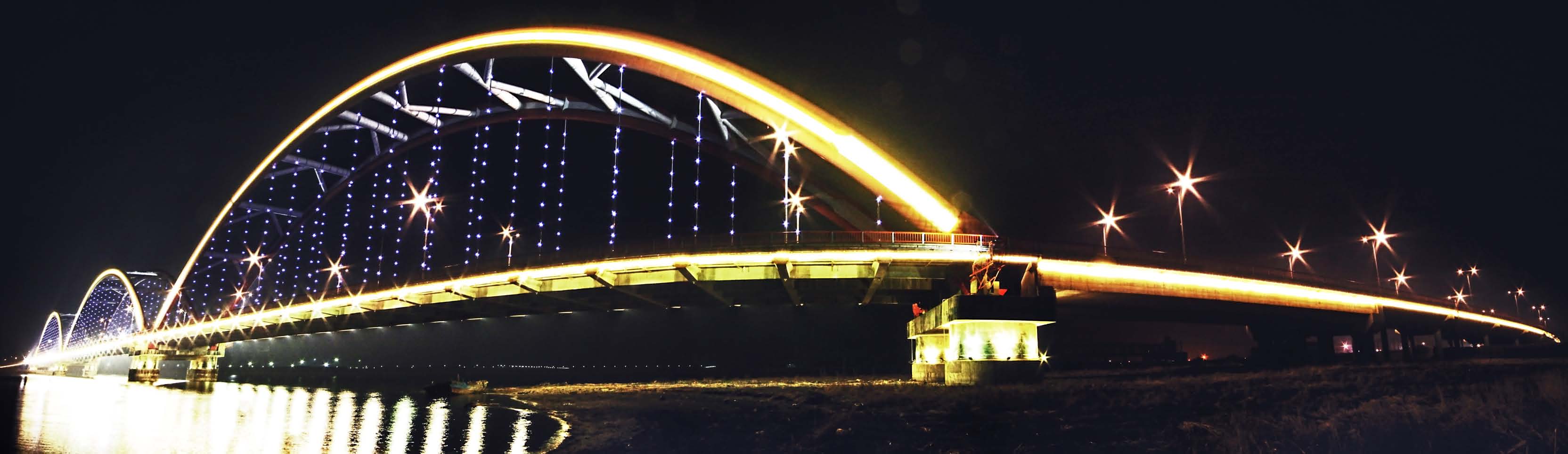 彩虹大桥,是连接中新天津生态城、滨海新区旅游区最为重要的通道。在项目实施初期,我们就综合了夜景道路照明与桥体装饰效果相融合的设计理念,在光源的搭配方面,我们同样尊重“彩虹”的理念构想,利用不同种类及形状的LED灯具进行混搭风格的演绎,力图传递彩虹大桥功能性与观赏性浑然一体的照明风格。