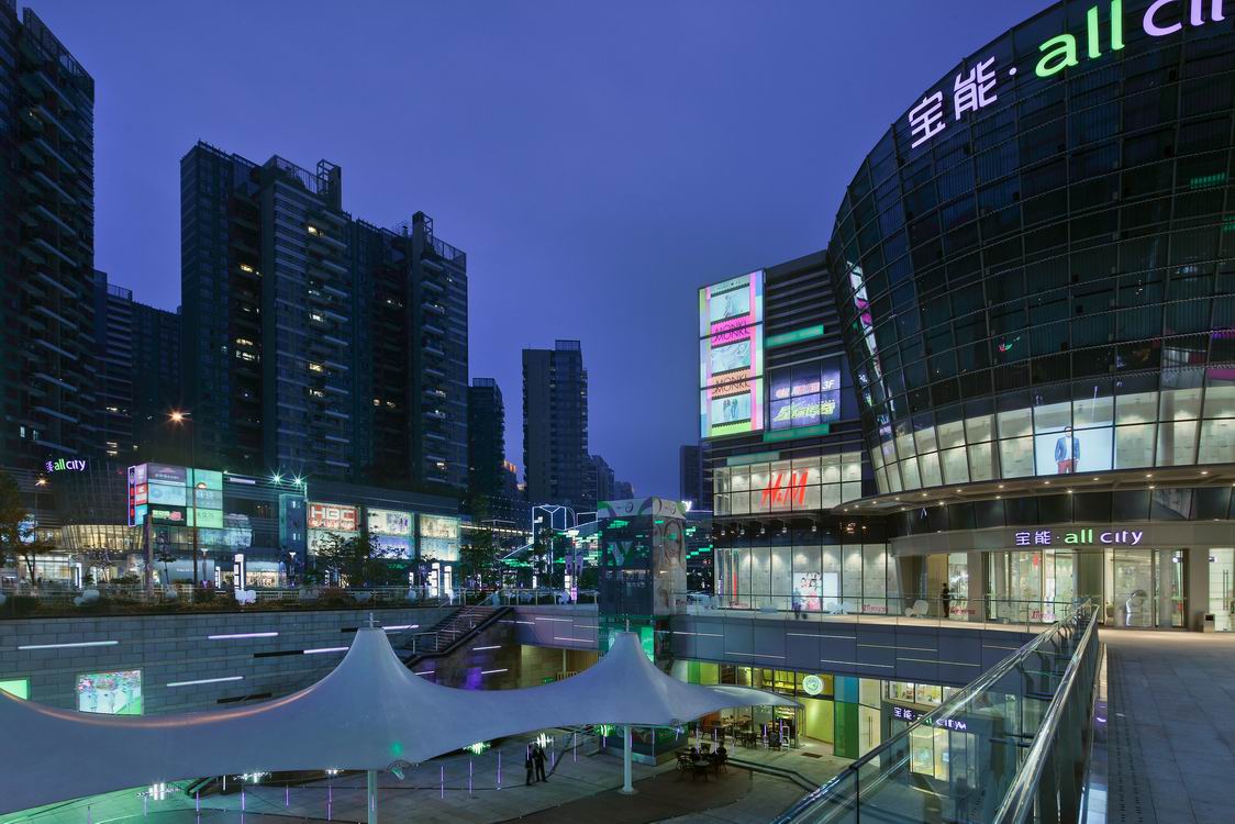 All city坐落在毗邻香港的“香榭丽”大道——深圳湾中心路,以不同业态的南北两区组成极富特色的双核商业集群,共5层,同时拥有6个主入口与9个内中庭。以购物、娱乐、餐饮为主体,集快速时尚店、精品超市、环球美食、儿童乐园、健身休闲、数码影城等丰富业态为一体。