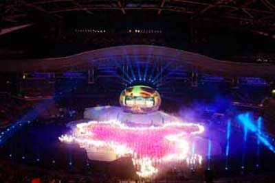 2007年11月10日晚,广州奥林匹克体育中心成了全国各族人民欢聚的大舞台。第八届少数民族运动会开幕式在这里隆重举行,34个代表团、55个少数民族、近15000人的规模,使本届运动会成为盛况空前的一次民族运动会。