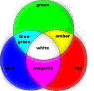 色光混合中,三原色光是朱红、翠绿、蓝紫,它们都不能用其它色光相混产生。朱红与翠绿 相混得黄色光;翠绿与蓝紫相混得蓝色光;蓝紫与朱红相混得紫红色光;黄色光、蓝色光、紫色光为间色光。当三源色光按照一定比例相混时,所得到的光是无彩色的白色光或灰色光。