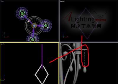 灯吊饰的金属链其实也是用线来创建,在前和左视图分别创建两个相扣的菱形,然后选择顶点光滑