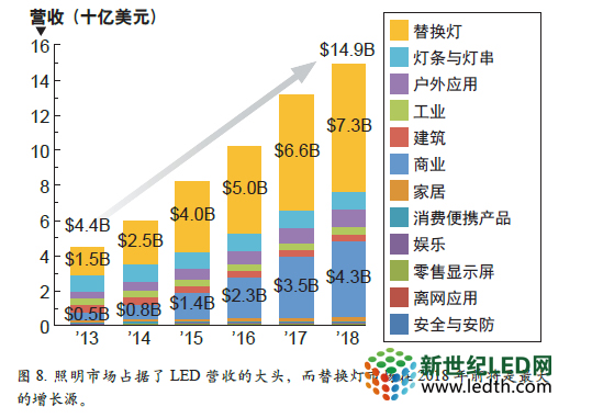 LED也许确实可以变革照明产品设计,但图8清晰表明,截至2018年替换光源市场将是采用LED最多的照明产品。这个图表非常有意思,光源占据了2013年灯具领域营收的大头,总体光源LED营收非常惊人,达到了15亿美元。但很快光源的LED营收将占据照明市场的一半。