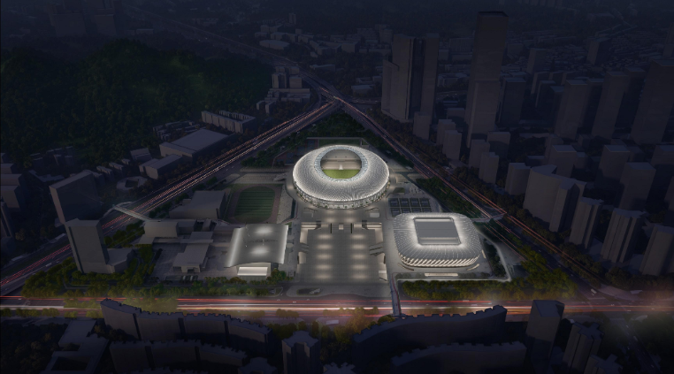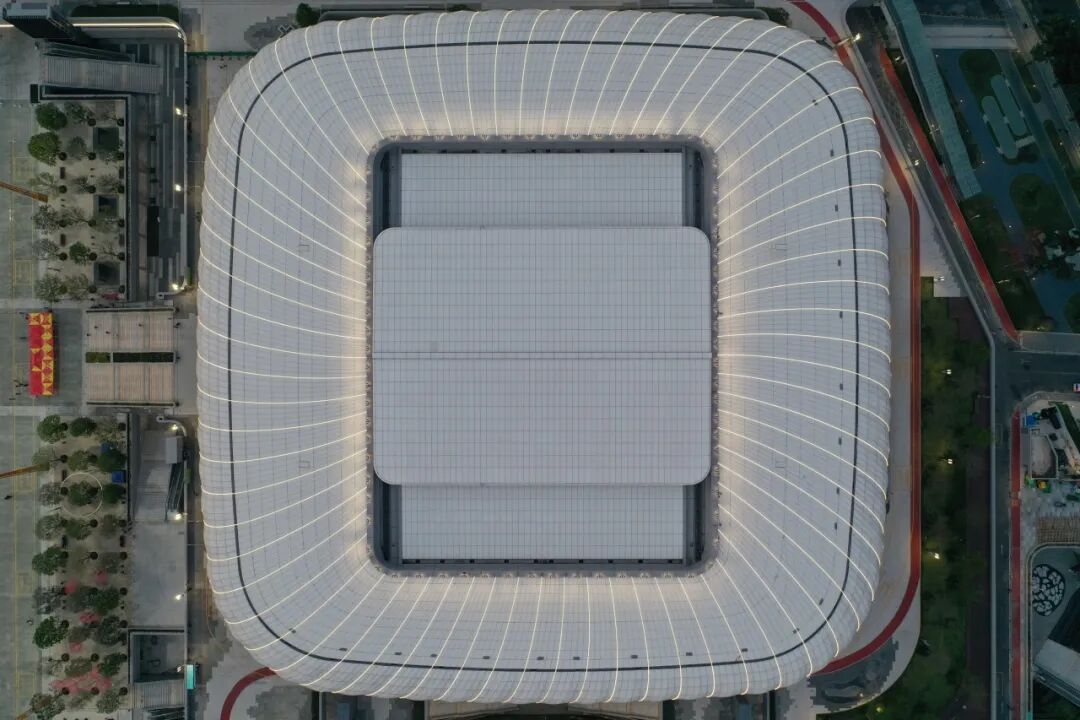 “藏”在建筑里的灯光美学:体育馆立面幕墙的洞口暗藏灯具,光线从强到弱自然过渡,搭配线条灯勾勒动感肌理;体育场以女儿墙外环中心线为“强光核心”,上下光线逐步退晕,“一面一道光”的设计避免光线相互干扰,白天看不到突兀的灯具,夜晚却能让建筑轮廓灵动起来,真正实现“见光不见灯”。