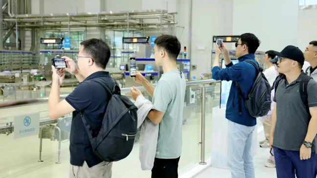 在参观过程中,智能工厂的机器人“天团”引发阵阵惊叹。液态奶生产基地每小时灌装40000包牛奶,打造全球最快生产线;奶粉智造基地实现微克级精准配比,智控系统24小时全天候守护品质。这些场景生动展现了数智伊利的技术实力。