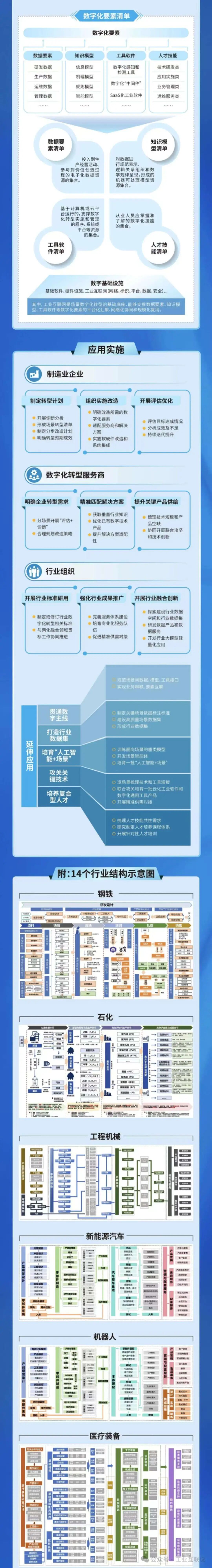 >>> 指引的智慧化亮点,在于创新提出“一图四清单”的系统化工具,把抽象的智慧转型需求转化为清晰可落地的行动框架。 “一图”即行业智慧场景图谱,成为各行业的“智慧转型路线图”。它以“业务需求为主线、智慧技术为支撑”,按照“5类核心业务+N个智慧场景+4类数字要素”的逻辑搭建。 比如在新能源汽车行业,图谱明确列出“智慧研发仿真”、“智能生产调度”、“车路协同运维”等核心场景; 在医疗装备领域,则聚焦“设备智慧诊断”、“远程运维服务”等关键环节。 每个场景都标注了对应的智慧技术方向,像工业互联网、人工智能、数字孪生等技术的应用节点一目了然,企业能快速找到适配自身的智慧化切入点。 “四清单”是智慧化要素支撑清单,相当于转型的“智慧资源包”。包含数据要素、知识模型、智能工具、数字技能四类核心资源: ·数据要素清单明确各智慧场景需采集的设备数据、生产数据等关键信息; ·知识模型清单涵盖行业专属的智能算法、仿真模型等; ·智能工具清单罗列了适配场景的工业软件、AI分析平台等; ·数字技能清单则指明了岗位所需的智慧设备操作、数据建模等能力。 这套清单让企业清楚“智慧化需要什么资源”,避免了盲目采购智能设备、重复开发系统的浪费。 这种“图谱+清单”的模式,本质上是搭建了“行业需求与智慧技术”的对接桥梁。以前企业想搞智慧生产,却不知道该用哪种AI算法、对接哪些数据;服务商推出的智能方案,也常因不符合行业实际而“水土不服”。现在通过图谱精准匹配场景与技术,清单明确资源需求,供需双方能快速达成共识,大幅提升智慧化落地效率。 ●●○●●○●●○●● 14大行业全面覆盖 定制化方案瞄准核心场景 <<< 指引针对不同行业的特点,量身定制了智慧化转型路径,覆盖从传统制造到高端装备的多个领域,每个行业都有清晰的智慧化突破方向: 重工业领域:钢铁行业聚焦“高炉智能监控”、“能耗智慧优化”场景,通过物联网传感器实时采集炉温数据,结合AI模型动态调整参数,实现低碳与高效生产;石化行业则重点推进“管道智慧巡检”、“危化品智能预警”,借助无人机巡检+机器视觉识别,替代人工完成高危环境作业。 高端制造领域:新能源汽车行业主打“智能产线协同”、“电池智慧管理”,通过数字孪生技术构建虚拟产线,提前预判生产瓶颈,依托智能算法优化电池充放电策略;医疗装备行业聚焦“设备远程诊断”、“精准运维服务”,让高端医疗设备通过5G网络实现故障实时预警,缩短维修响应时间。 消费品领域:家电行业侧重“个性化智能定制”、“智慧供应链管理”,消费者可通过APP自定义产品功能,企业依托智能排产系统快速响应订单;食品行业则聚焦“生产过程智慧溯源”,通过区块链技术记录原料采购、加工、运输全流程数据,实现“来源可查、去向可追”。 <<< 这份指引的适用范围远超企业本身:对政府和行业协会而言,可依托图谱培育智慧化典型案例,制定行业统一的智能技术应用标准;对中小企业来说,能借助清单对接公共智慧服务平台,共享行业知识模型、智能工具等资源,降低智慧化门槛,形成“大中小企业协同智慧转型”的生态。