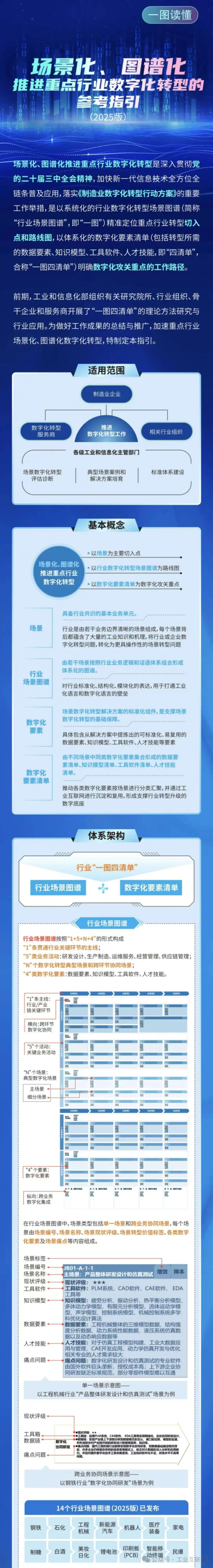 9月16日,工业和信息化部正式印发《场景化、图谱化推进重点行业数字化转型的参考指引(2025版)》。这份指引以“智慧化”为核心,为钢铁、新能源汽车、医疗装备等14个重点行业量身定制数字化转型“实战手册”,旨在推动新一代信息技术从“单点应用”迈向“全场景渗透”,彻底破解企业“转型不会转、下手无处下手”的痛点。 ●●○