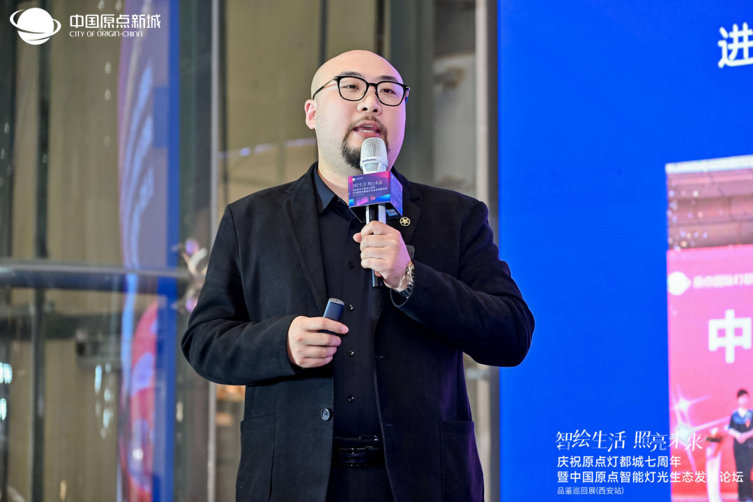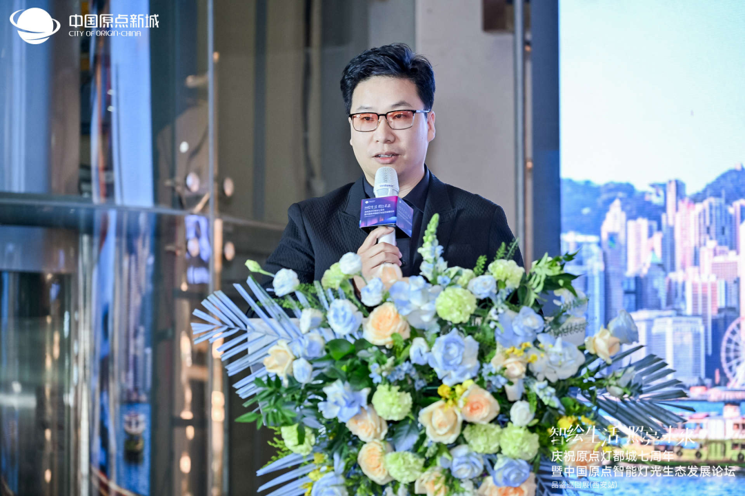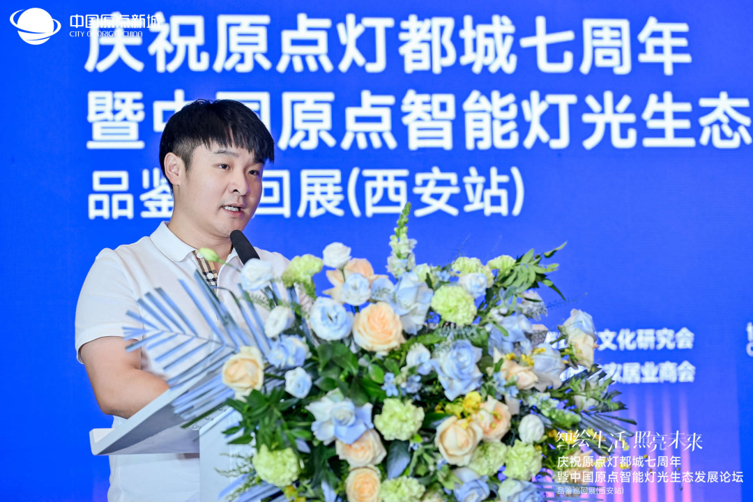 中国原点新城副总裁李恒威介绍了原点灯都城A3 馆焕新升级为“智能灯光体验馆”,强调将以“智能”为核心打造“西北灯饰第一城”。中国原点新城优居美宅总经理刘枼铄现场发布智能灯光体验馆规划,提出将通过十大专项政策推动智能生态产业链发展。