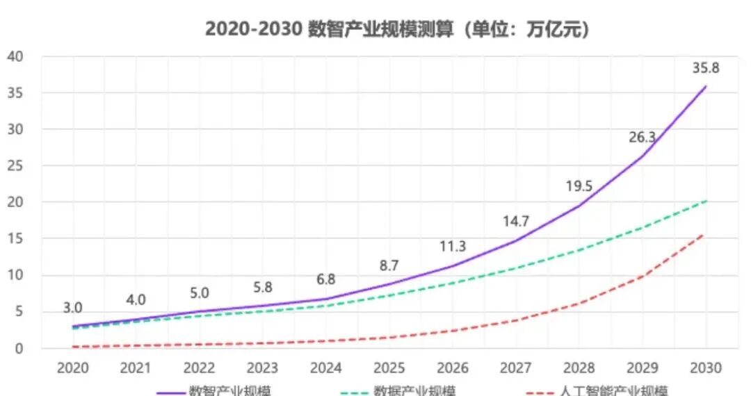 据《报告》测算,2024年我国数智产业规模为6.78万亿元,2020-2024年间年均增长率为26%;预计2024-2030年,我国数智产业规模将维持28%的年均增长率。据此推算,2025年我国数智产业规模将达到8.71万亿元,2026年突破10万亿元,2030年达到35.8万亿元。