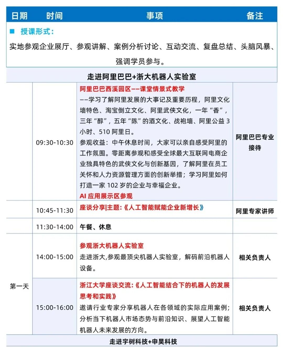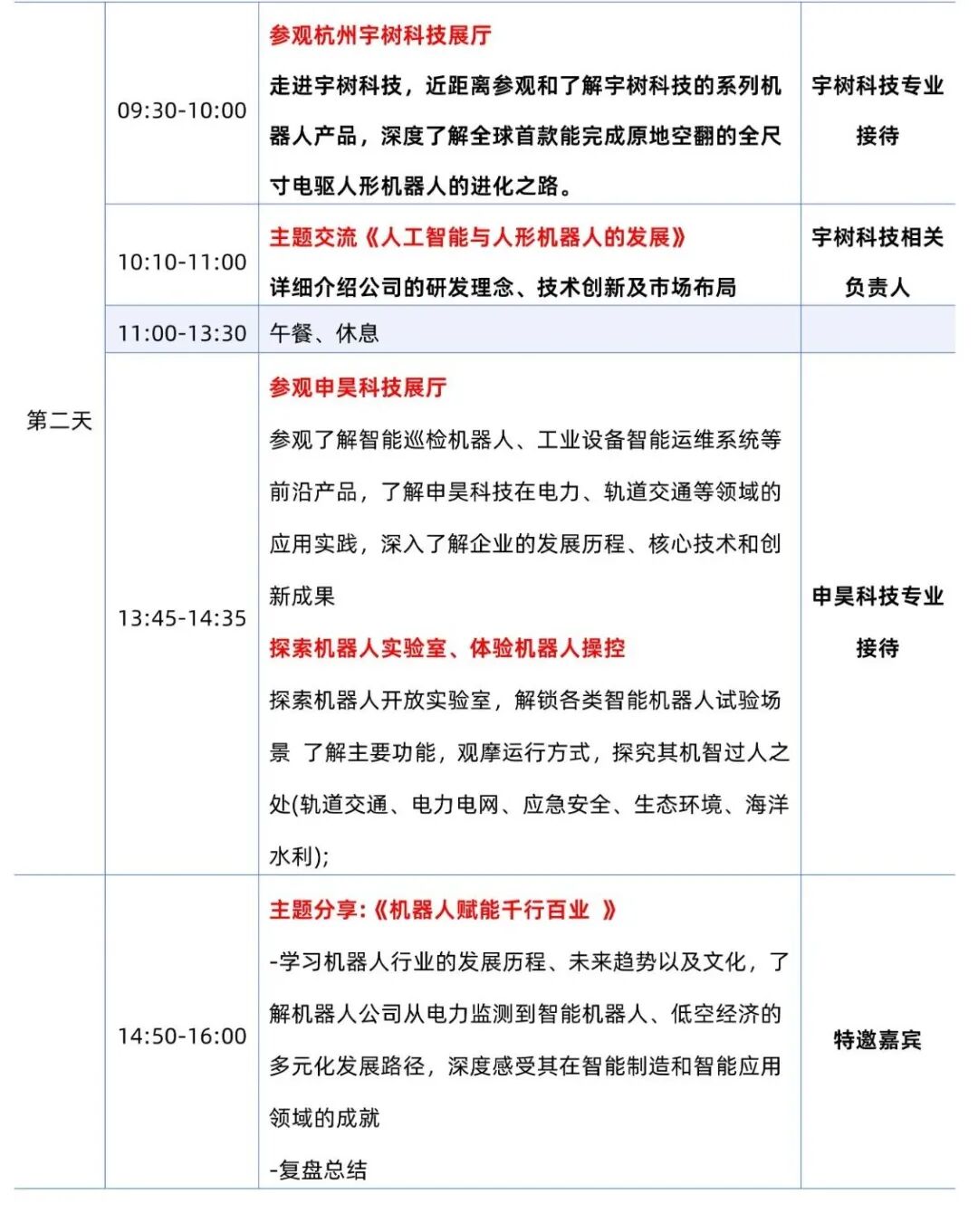 全天都在企业内部进行参观+交流,参观企业展厅,由企业专业人员讲解关于宇树科技、科大讯飞、申昊科技、和浙大机器人基地的特色企业文化,走进这些创新科技企业,紧密贴合行业热点,学习创新逻辑,体验创新科技带来的安全、智慧、便捷
