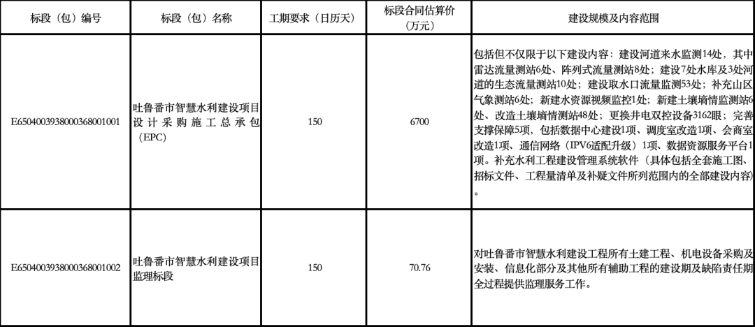NO.3 吐鲁番市智慧水利建设项目设计采购施工总承包(EPC) 一、项目概况 项目编号:E6504003938000368001 项目名称:吐鲁番市智慧水利建设项目设计采购施工总承包(EPC)、监理标段招标 项目投资:6700万元 建设内容:河道来水监测14处,生态流量测站10处,地表水取水口流量监测53处,补充山区气象测站6处,新建水资源视频监控1处,新建土壤墒情监测站6处、改造土壤墒情测站48处,更换井电双控设备3162眼,完善智慧水利平台支撑保障,补充水利工程建设管理系统软件。 建设地点:吐鲁番市高昌区、鄯善县、托克逊县 招标单位:吐鲁番市水资源管理中心 资金来源:地方政府一般债券资金及地方配套 招标范围: 二、招标文件的获取 获取时间:2025年10月11日至2025年10月20日。 获取方式:请到吐鲁番市公共资源电子交易系统 https://www.tlfsggzy.cn/TPBidder/memberLogin领取招标文件。 招标文件费用:0.0元 三、投标文件的递交 递交截止时间:2025年11月3日10:30; 递交方法:请到吐鲁番市公共资源交易网https://www.tlfsggzy.cn/TPBidder/memberLogin递交招标文件 四、开标时间及地点 开标时间:2025年11月3日10:30; 开标地点及方式:吐鲁番市公共资源交易网https://www.tlfsggzy.cn/TPBidder/memberLogin,线上开标 五、投标人资格要求 1、企业资质要求: EPC标段:投标人须是在中华人民共和国境内注册、具有独立法人资格,能够独立承担民事责任;具备工程设计水利行业甲级及以上资质;具有电子与智能化工程专业承包壹级资质,具有有效的安全生产许可证,并在人员、设备、资金等方面具备相应的能力,近年有类似项目业绩;监理标段:投标人须具有独立法人资格,具备工程监理综合资质,近年有类似水利信息化监理业绩,并在人员、设备、资金等方面具有承担本标段监理的能力。 2、项目负责人资格要求: EPC标段: ①工程总承包项目经理:具有水利工程相关专业或电子与智能化工程相关专业(计算机、电子、通信、自动化、电气等)高级及以上技术职称。不得同时在两个及以上项目中担任工程总承包项目经理、施工项目负责人。 ②设计项目负责人:具有水利工程相关专业或电子与智能化工程相关专业(计算机、电子、通信、自动化、电气等)高级及以上技术职称; ③施工项目负责人:应具有一级建造师(机电工程或通信与广电工程专业)注册证书、及有效的建安B类安全生产考核合格证;具有电子与智能化工程相关专业(计算机、电子、通信、自动化、电气等)中级及以上技术职称或具有信息系统项目管理师证书。不得同时在两个及以上项目中担任工程总承包项目经理、施工项目负责人,有类似项目业绩。 ★若为联合体投标,则总承包项目经理须由联合体牵头方单位派出,总承包项目经理和设计负责人可由同一人担任。监理标段:总监理工程师具有信息化类相关专业高级及以上技术职称,或具有注册监理工程师证书(通信专业或水利工程专业)。本单位注册且在有效期内,有类似总监理工程师业绩,且不得同时在两个及以上工程中担任项目总监理工程师。 3、本项目EPC标段接受联合体投标,监理标段不接受联合体投标。 ①采用联合体投标的,联合体成员必须具备独立法人资格,联合体成员数量不得超过3家(含联合体牵头人),联合体牵头人须为设计单位; ②联合体各方应按招标文件提供的格式及要求签订联合体协议书,明确联合体牵头人及联合体各成员应承担的职责。联合体牵头方的法定代表人或其委托代理人负责签署本次投标相关资料,联合体成员方必须在联合体协议中承诺对此予以认可。 ③联合体各方不得再以自己名义单独或通过加入其他联合体参加本项目的投标,否则相关投标均无效。 ④若联合体投标人中标,未经招标人同意,联合体的成员结构、相互关系均不得变动。 后台回复“吐鲁番”获取项目联系方式