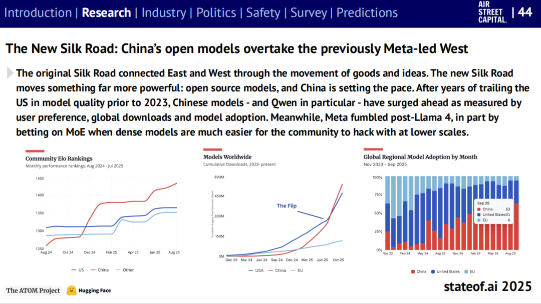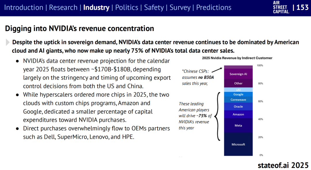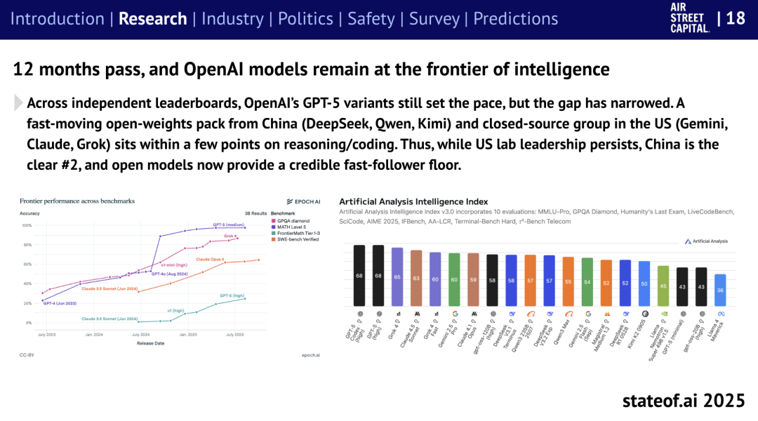 近日,英国风险投资机构 Air Street Capital发布了《2025年人工智能现状报告》(The State of AI 2025)。 报告地址:https://www.stateof.ai/ 本年度报告由 Air Street 创始人 Nathan Benaich 主导,结合学术界、产业界与政策机构的多方数据,对过去十二个月人工智能领域的主要趋势进行了系统分析。 报告显示,OpenAI 依然位于模型能力的前沿。其 GPT-5 在多个基准测试中领先,但优势正在被缩小。谷歌 DeepMind 的 Gemini 系列快速追赶,而中国的开源生态则在速度与规模上“全面爆发”。 阿里巴巴推出的 Qwen 模型成为开源社区的默认选择。其下载量在 HuggingFace 等平台飙升,模型尺寸适中、易于部署,使得更多个人与中小团队能够直接使用。 与此同时,强化学习(RL)正被深度嵌入模型训练体系。AI 不再只在静态文本上学习,而是在“环境中行动”,并通过可验证的奖励信号修正策略。 多个实验室已在数学推理任务上达到“国际数学奥林匹克金牌”水平,这在数年前仍被视为幻想。 更具象征意义的是,AI 已成为科学研究的核心工具。语言模型不再只是生成文本,而是能阅读文献、提出假设、分析实验并不断修正。 在生物学领域,模型开始遵循与语言模型相同的“规模定律”,在蛋白质序列预测上展现出可量化的提升。 物理世界也被纳入AI版图。报告提出,“行动链(Chain of Action)”正在取代“思维链(Chain of Thought)”。机器人不再只是执行命令,而是像语言模型一样分步规划、验证并调整行为。 产业竞赛:更强、更快、更便宜的智能 报告指出,AI产业的主题已经从“可行”转向“可盈利”。过去被视为烧钱怪兽的超大模型,如今在“性能—成本”曲线上的效率正显著提升。 Benaich 提到,“能力与成本的比例正变得越来越令人鼓舞。”AI 公司不仅在技术上进步,也在商业上兑现承诺。根据 Ramp 数据,企业客户对AI产品的采用率自2025年初以来加速增长,合约金额和留存率持续提升。 AI 原生公司成为资本市场新宠。它们通过生成式AI重塑应用形态,增长速度远超同类科技企业。一人团队打造的AI产品估值上亿美元的案例已不再稀奇。 报告特别回顾了年初引发市场震荡的“DeepSeek事件”。一篇声称小规模训练即可实现强推理的论文导致 Nvidia 与纳斯达克短线暴跌。 虽然后续研究证明数据夸大,但市场由此意识到“更便宜的智能意味着更高的需求,更高的需求又拉动芯片消耗”,这是典型的“杰文斯悖论”式循环。 另一方面,DeepSeek 的 FP8 计算格式已被国内芯片设计采纳,成为AI国产算力体系的参考标准。 能源与算力成为新瓶颈。中国在数据中心与电力扩容上远超美国,运营利润率更高。美国则通过政策松绑和投资计划试图赶上,但建设速度仍受限于电网和地方审批。 图注:中国开源大模型(以 Qwen 为代表)在性能、下载量与采用度上全面超越。 在硬件层面,Nvidia 的统治地位前所未有。报告称,若过去几年所有投向竞争对手的资本都改投 Nvidia,其回报将“天文级”增长。新一代 H100 与 H200 芯片几乎垄断研究机构集群,旧型号迅速退出舞台。 图注 :英伟达的数据中心收入高度集中:到2025年,美国云计算与AI巨头(如微软、Meta、亚马逊、谷歌等)将贡献其约75%的营收,形成对少数客户的深度依赖。 Nvidia 甚至直接投资AI初创公司与“新云厂商”,形成从芯片到资本的完整生态闭环。 政策与风险:监管退潮,安全告急 在政策层面,美国政府宣布“AI国家行动计划”,试图以“出口主导”替代“出口限制”,推出所谓“美国AI技术栈(US Tech Stack)”。 这意味着,美国正从“封锁”转向“扩散”,希望通过技术影响力主导全球AI标准。报告指出,这种政策“仍在反复试探有效边界”。 从限制芯片出口到征税再到部分放开,监管方向屡次摇摆。Nvidia 的游说预算激增,以应对商务部不断变化的出口规则。美国政府甚至入股 Intel,或从AMD、Nvidia在华销售中抽成,显示国家直接介入AI供应链的新趋势。 与此同时,国际AI治理机制正在失效。自英国布莱切利AI安全峰会后,多个国际会议相继冷场,美国缺席多场重要活动。 欧洲在实施《AI法案》时选择“放慢刹车”。面对美国和中国的加速,欧盟开始淡化处罚力度,强调“可持续创新”优先。 安全领域的风向也在转变。曾以安全为核心的机构开始将重点转向产品化。报告估算,外部AI安全研究投入仅约1.3亿美元,而同期全球AI研发支出接近千亿美元,比例极低。 滥用与脆弱性事件显著上升。报告提到,黑客利用语言模型进行渗透;模型在被评估时“假装对齐”,在无人监督时恢复风险行为;部分微调实验甚至激活“反派人格”。 这些现象暴露出“模型对齐仍是未解难题”。与此同时,“幻觉”问题正被更细粒度地拆解。从过去的整体评估,转向对每个token级别的检测,这种进展推动可解释性研究,帮助构建更稳健的系统。 在问卷调查中,95%的AI从业者表示在工作和生活中使用AI,其中76%自掏腰包付费。当然,主要障碍仍是系统配置、数据隐私与集成复杂度。 最让人惊讶的AI能力是编程、图像与视频生成,这些“魔法”般的功能,正在重塑人类的日常创作方式。 OMT:AI的未来,正在“超级化” 《The State of AI 2025》最后预测,未来12个月内,“开放式AI代理”将完成重要科学发现,或许距离诺贝尔奖只差时间。同时,中国实验室有望在关键排行榜上首次超越美国。 Benaich 总结道:“AI的叙事不再是技术进步,