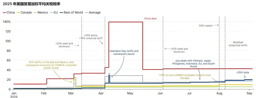 美在特朗普二度上台后关税水平一路高升,其中对华加权关税水平为全球最高。