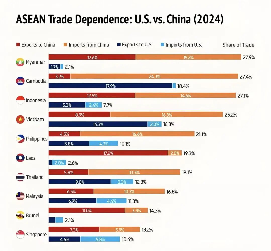 另外看下周边国家情况,2025前三季度,越南外贸进出口总额达6806亿美元,同比增长17.3%;泰国外贸进出口总额约5505亿美元,同比增长22.2%;柬埔寨外贸进出口总额约470亿美元,同比增长16.9%。