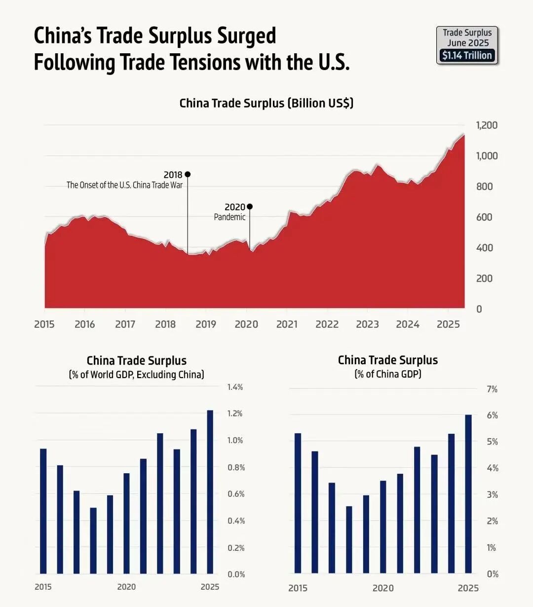 中美贸易摩擦期间,中国贸易顺差不降反升,将招致更多压力。