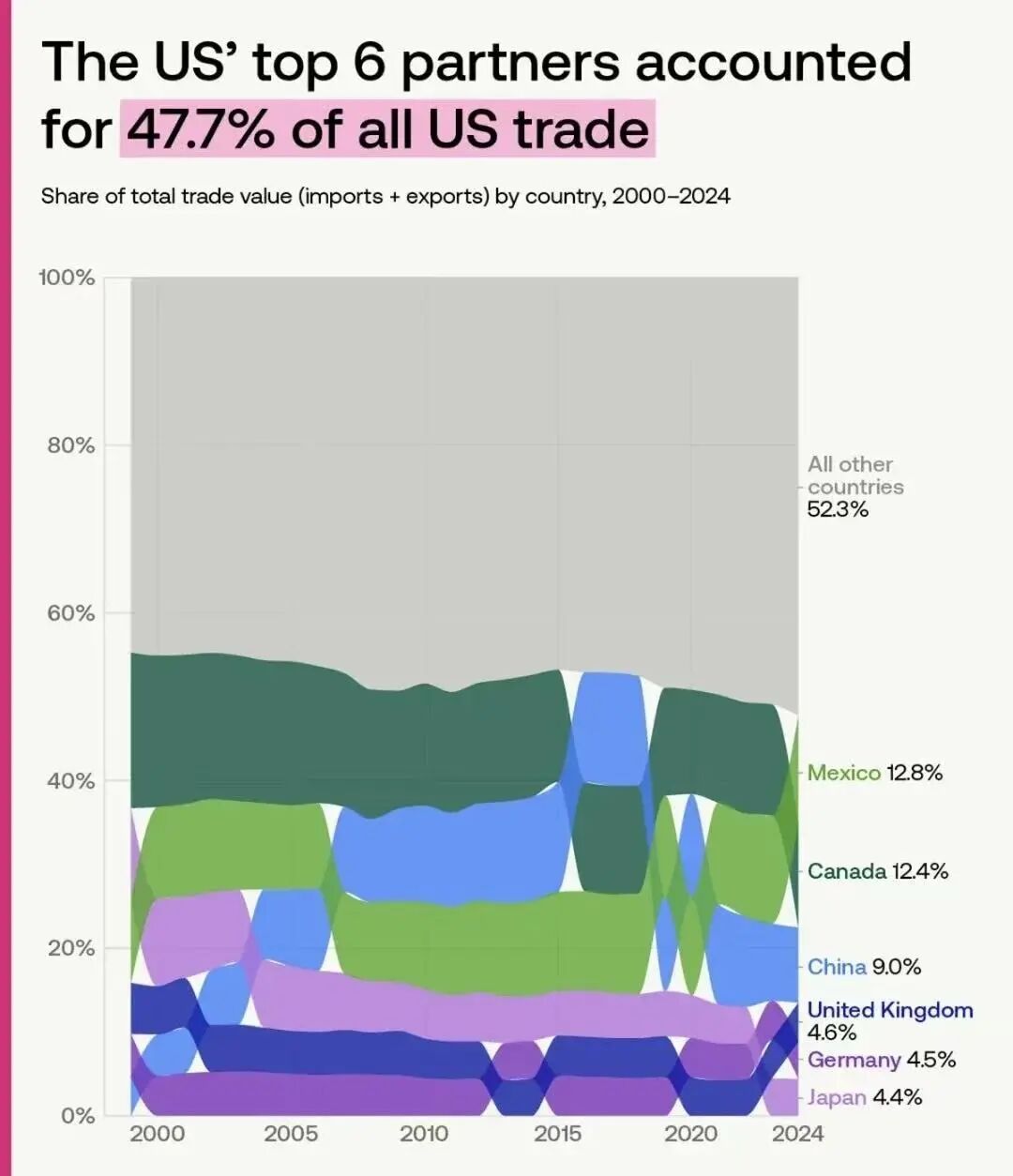 中国已从疫情前美国头号贸易伙伴下降至第三,所占份额也从15%左右下降至9%,几乎跌回二十年前水准。