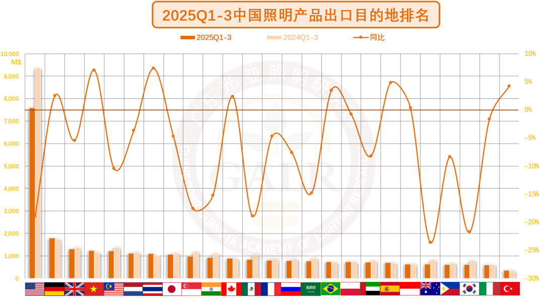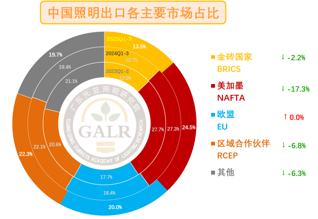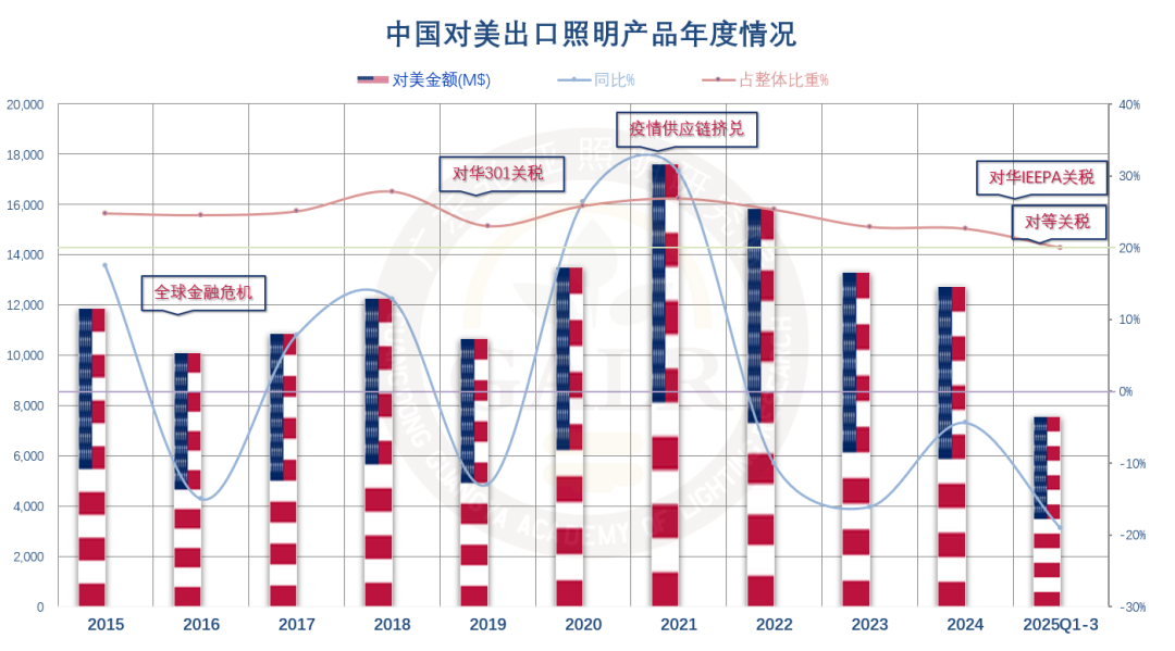 导致2025年前三季度,中国照明产品对美出口同比下滑19%,为大盘最大拖累,占总额比重历史上首次跌破20%大关。