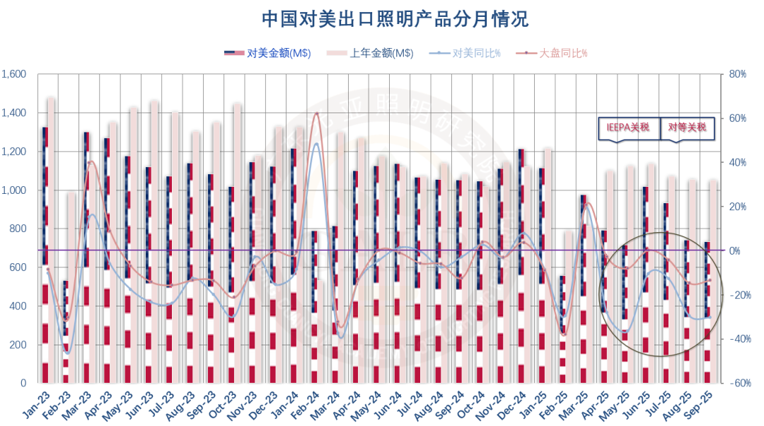 大势如此,照明外贸整体内卷外压的状况短期内难以扭转,春节错位和关税过渡期造成的“抢出口”和“抢转口”在一定程度上已透支了后续需求,10月10日美国再度极限施压的100%额外关税更是雪上加霜,照明出口规模连续第四年收缩的局面已成定局。