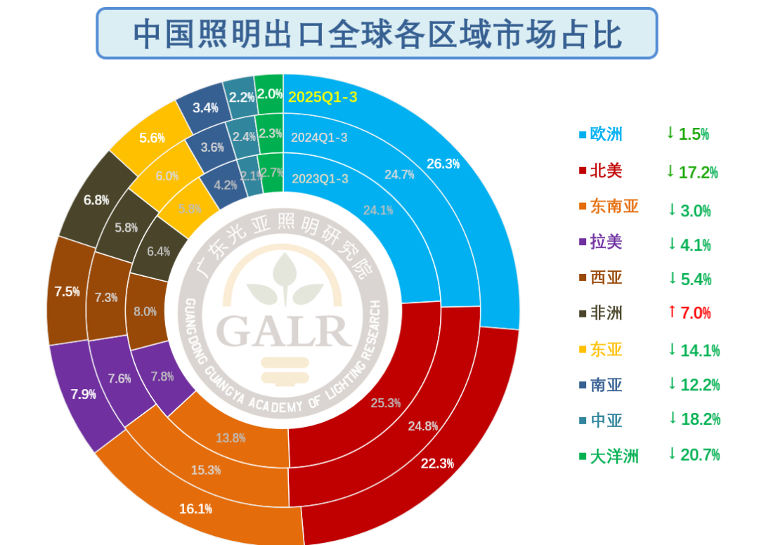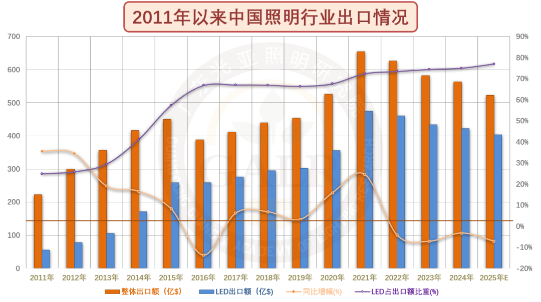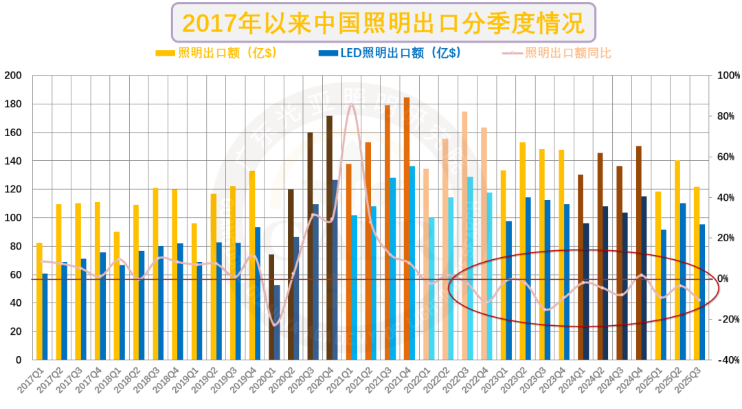 中国照明出口规模自2021年顶峰后已连续三年萎缩,2025年将延续下滑态势。