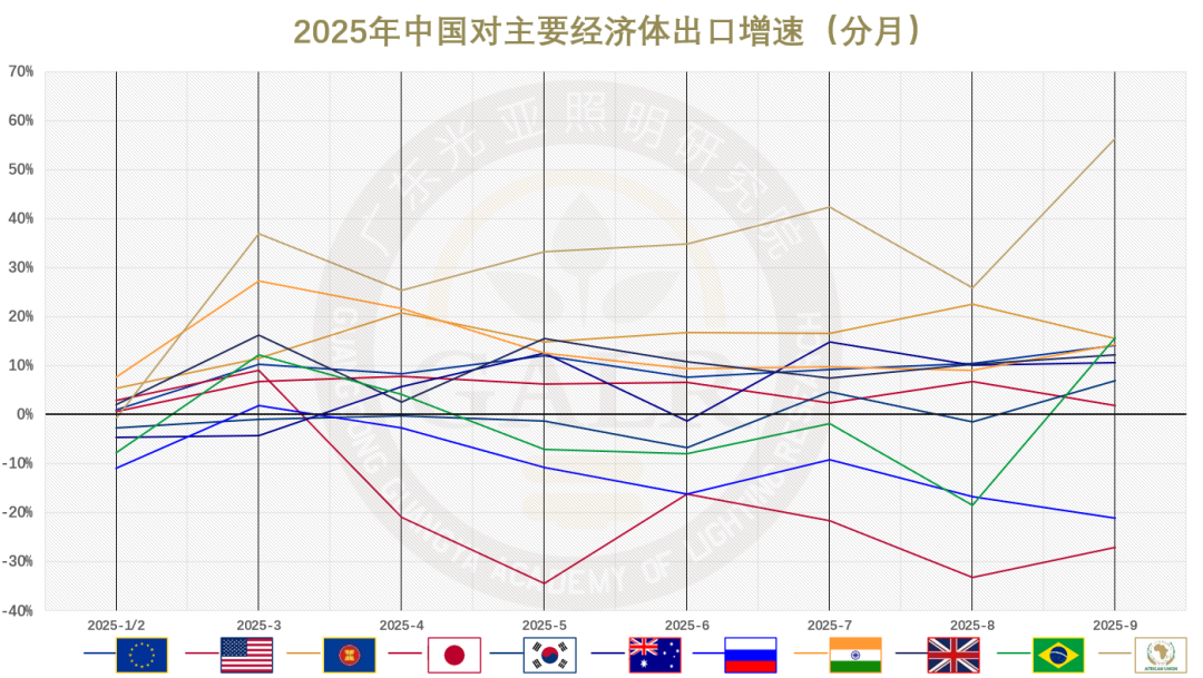2025前三季度出口,非洲增长迅猛,欧洲英国印度涨势不错,日本差强人意,澳洲韩国巴西较为低迷,美俄成为主要拖累。
