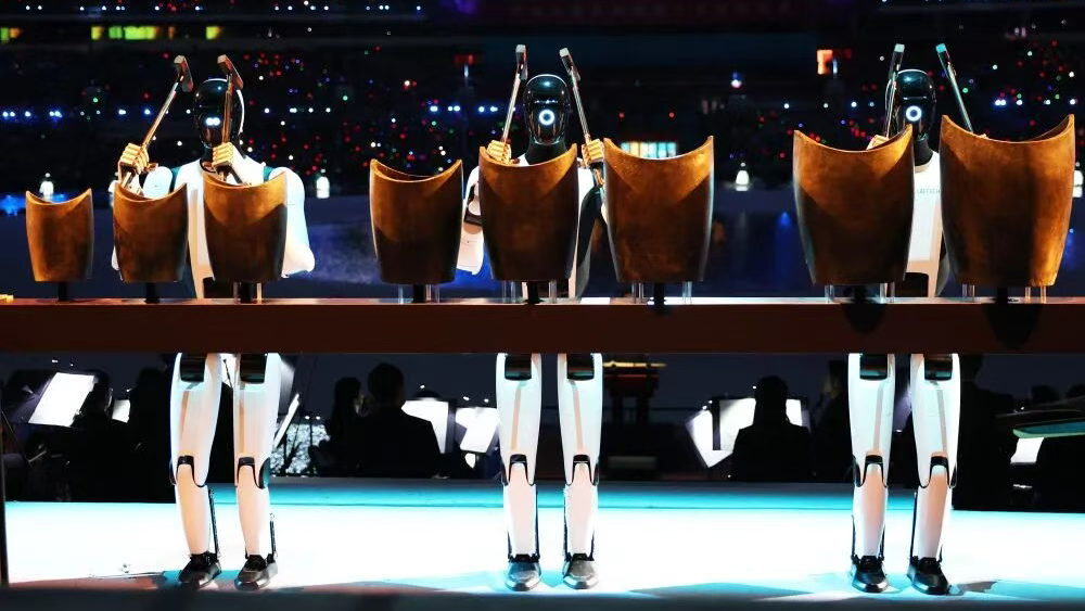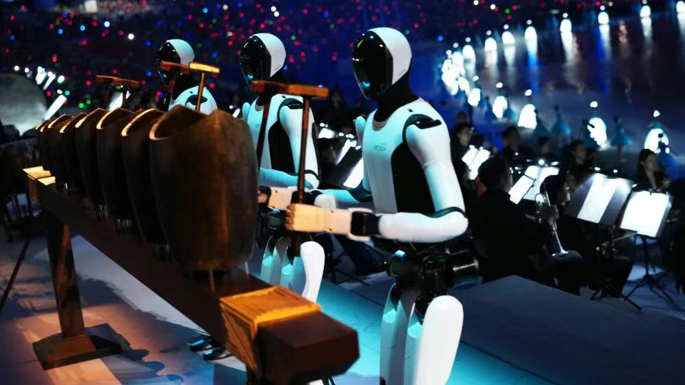 02 开幕重构 从“人机协作”到“文明对话” 11月9日晚的全运会开幕式上,数智元素成为最大亮点之一。三台优必选全自主具身智能人形机器人Walker S2代表粤港澳三地,手持击槌敲响广州南越王墓出土的8件青铜句鑃,奏响广东音乐经典《彩云追月》,正式拉开赛事大幕。 机器人精准的动作、与古典乐器的巧妙配合,不仅展现了我国人形机器人技术的顶尖水平,更以“数智+古典”的创意形式,凸显了粤港澳大湾区的科技实力与文化底蕴,成为全运会开幕式上令人难忘的科技名片。