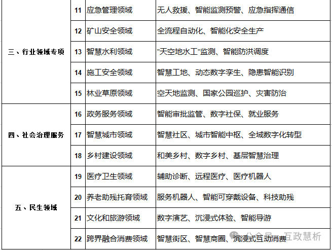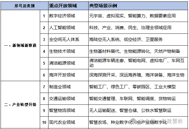 2、具体摘要如下: 一、总体要求 指导思想:以习近平新时代中国特色社会主义思想为指导,贯彻新发展理念 核心路径:形成"技术突破—场景验证—产业应用—体系升级"的闭环 目标:发挥超大规模市场优势,建设综合性重大场景、行业集成式场景和高价值小切口场景 二、加快培育拓展经济社会应用场景 (一)打造新领域新赛道应用场景 数字经济:挖掘数据要素潜能,探索元宇宙、虚拟现实、智能算力、机器人等应用 人工智能:加强核心技术攻关,加快高价值场景培育和开放 全空间无人体系:推动海陆空无人体系应用和标准建设,拓展低空经济等场景 生物技术:开放生物基材料替代、生物能源低碳转化、天然产物绿色制备等场景 清洁能源:推动清洁车辆在交通领域应用,创新智能电网、虚拟电厂、车网互动等场景 海洋开发:培育深海探测、开采、养殖、海洋装备等场景 (二)建设产业转型升级的新业态应用场景 制造业:创新柔性生产线、智能工厂、绿色工厂、零碳园区等场景,培育工业大模型应用 交通运输:创新智能交通管理、车联网、智能调度,开拓国际航班货物转运场景 智慧物流:发展智慧公路、港航、物流枢纽,探索无人运输、智慧仓储等场景 现代农业:推出智慧农场场景,推动育种、种养殖、食品加工全产业链数字化 (三)推出一批行业领域应用场景 应急管理:加强智能感知、无人救援、航空救援等技术应用 矿山安全:构建全流程自动化、智能化安全生产场景 智慧水利:推动"天空地水工"一体化监测,提升智能防洪、调度能力 施工安全:构建智慧工地、动态数字孪生模型,强化隐患智能识别 林业草原:推出林草调查监测、生态治理、灾害防治等空天地融合应用场景 (四)创新社会治理服务综合性应用场景 政务服务:推动智能预约、审批、监管,创新就业服务、数字社保场景 智慧城市:推进智慧社区、城市智能中枢、全域数字化转型 乡村建设:开放和美乡村、数字乡村建设场景,健全基层智慧治理体系 (五)丰富民生领域应用场景 医疗卫生:创新健康咨询、辅助诊断、远程医疗、用药审核等场景 养老助残托育:应用服务机器人、智能可穿戴设备、在线家庭医生等场景 文化和旅游:发展数字演艺、沉浸式体验、智能导游等数字文旅场景 跨界融合消费:培育5G、虚拟现实等融合应用,创建智慧街区、智慧商圈 三、深入推动场景开放和公平高效配置 加大开放力度:地方政府挖掘早期场景,国有企业开放主业领域,民营企业拓展新场景 公平高效配置:不得违规设置地域、企业性质等限制条件,发挥信用制度作用 协同推进改革:同步优化市场准入、创新要素配置(空天、深海、数据、人才等) 制度试验作用:在场景中验证制度政策,开展监管压力测试 四、提升应用场景保障能力 强化政策保障:与首台套、政府采购等政策协同,中央资金支持基础设施配套 健全管理制度:探索尽职免责模式,完善安全风险管控,防范重复建设和市场分割,统筹就业保护 五、加强组织实施 国家发改委牵头统筹协调,分批次推出应用场景项目清单 组织实施重大项目,做好经验总结和宣传推广 重大事项及时请示报告
