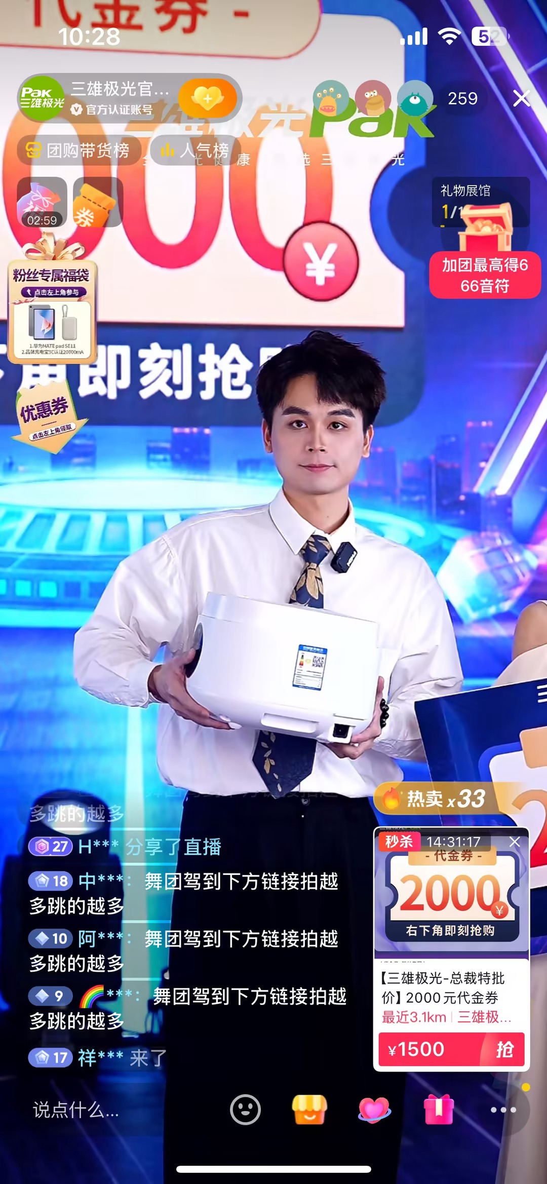 灯光闪烁,音乐律动。1月10日,三雄极光的林岩总裁走进「舞力即福利,总裁特批价」抖音直播间,以观众喜闻乐见的形式传递“光健康”,同时以热舞助兴、拍卖会互动、云逛展厅等趣味形式,在14小时内吸引了大量互联网用户互动与本地抖音达人现场打卡。