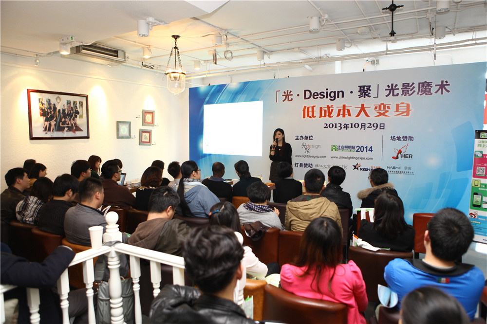 10月29日下午「光?Design?聚」光影魔术 — 消费场景低成本大变身设计师沙龙活动在北京举行。活动由「光?Design?聚」主办方策划,邀请了中外设计师讲解如何以低成本灯光设计改造消费环境,演讲嘉宾包括Liquidesign工作室总负责人法国认证建筑师/灯光设计师Jean-Jacques Lanzo (让-雅克 兰佐),BIAD郑见伟照明设计工作室室内灯光设计总监石巍巍,USTech?联合空间技术室内设计师国家高级照明设计师束旻。同时,主办方还邀请了场地赞助商Her Coffee业主代表朱小倩和主办单位雅式展览服务有限公司副经理朱明怡出席此活动。活动反响热烈,近70位室内设计师、照明设计师、连锁餐饮企业的品牌管理者及陈列师等聚首一堂,共话消费环境的低成本改造之道。