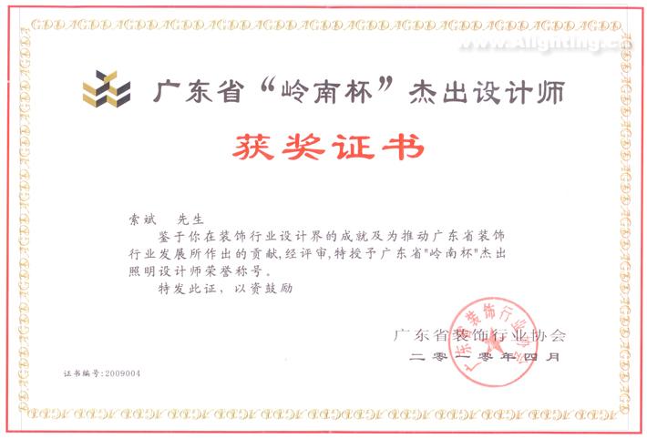 深圳市索氏景观设计有限公司设计总监索斌先生,与2010年4月获得广东省装饰行业协会颁发的“广东省杰出照明设计师”荣誉称号
