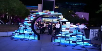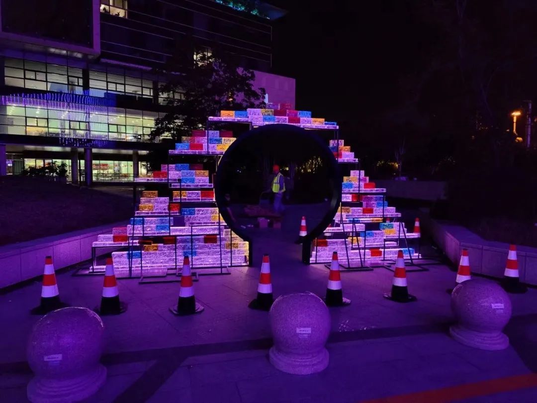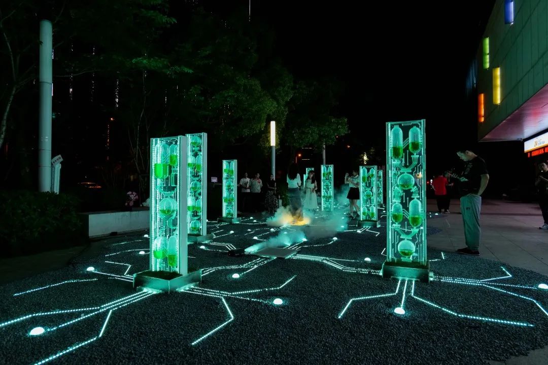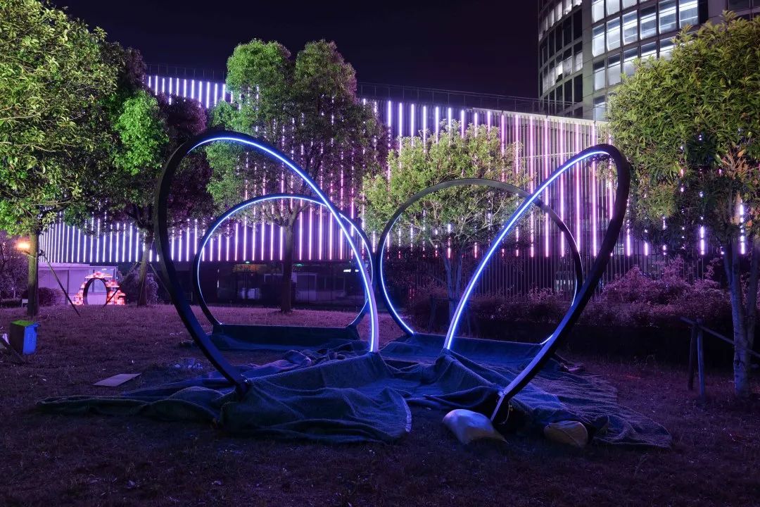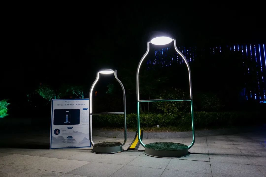 《水映》互动感应灯具装置,作品灵感从“水”而来,外观为单线条的水瓶造型,朝内有灯带照明,散射的光线和周围的草坪形成呼应关系。当有人站上去下半部的灯带立刻感应变色,且因设置的灯带位置稍微有变化,灯光产生微微的动态感,形成人站在水瓶里的状态。 作品欢迎观众站上去与其互动,其所形成的行为过程和结果意为探索人对水和空气等不同物质的需求探索和反思。[详情]
