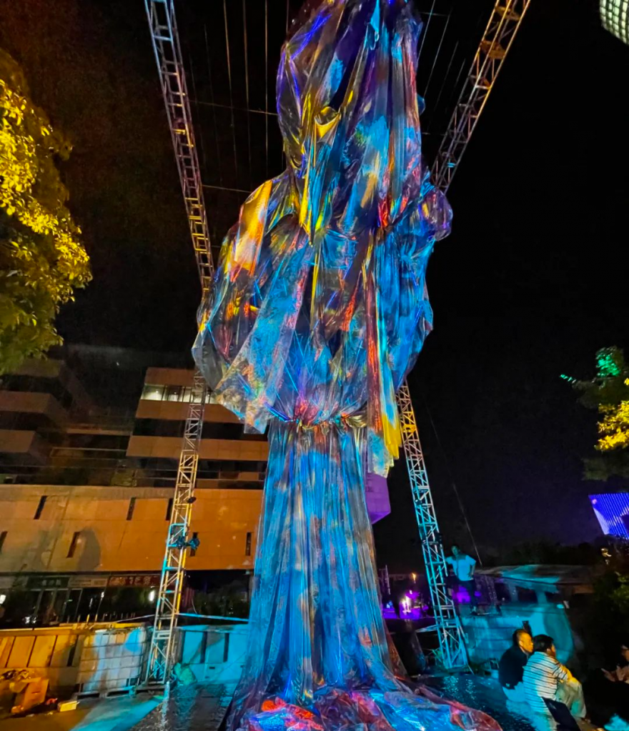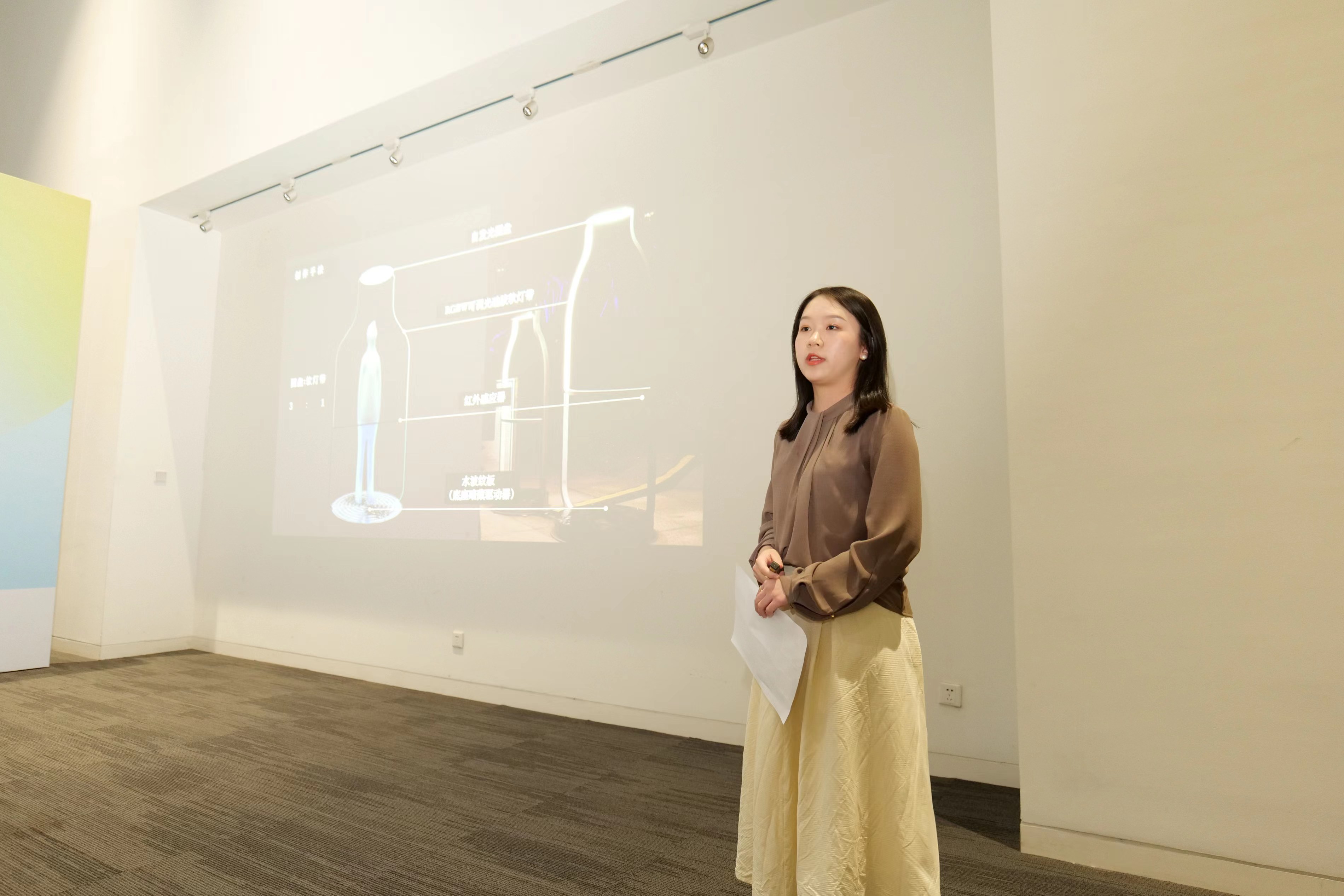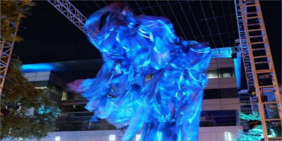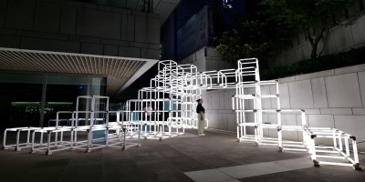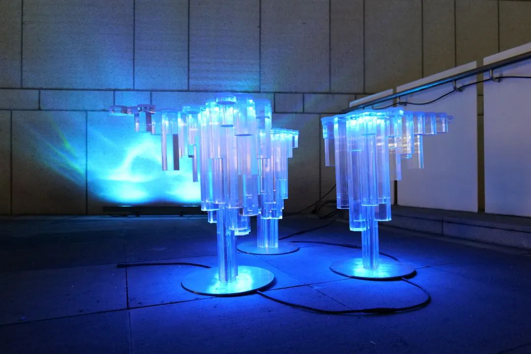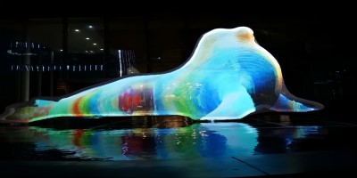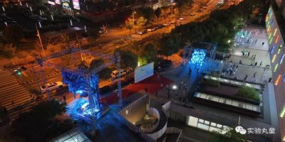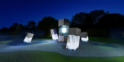《水映》互动感应灯具装置,作品灵感从“水”而来,外观为单线条的水瓶造型,朝内有灯带照明,散射的光线和周围的草坪形成呼应关系。当有人站上去下半部的灯带立刻感应变色,且因设置的灯带位置稍微有变化,灯光产生微微的动态感,形成人站在水瓶里的状态。 作品欢迎观众站上去与其互动,其所形成的行为过程和结果意为探索人对水和空气等不同物质的需求探索和反思。[详情]