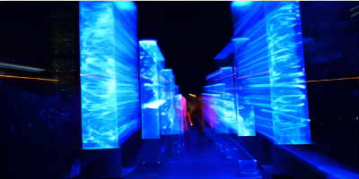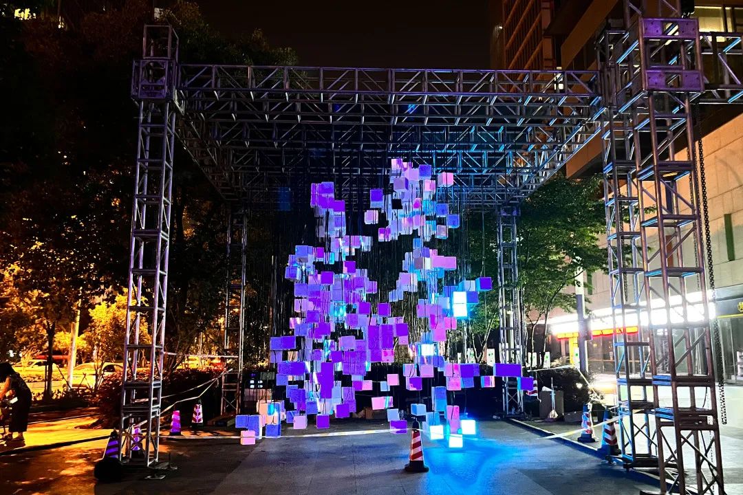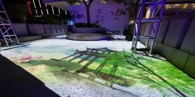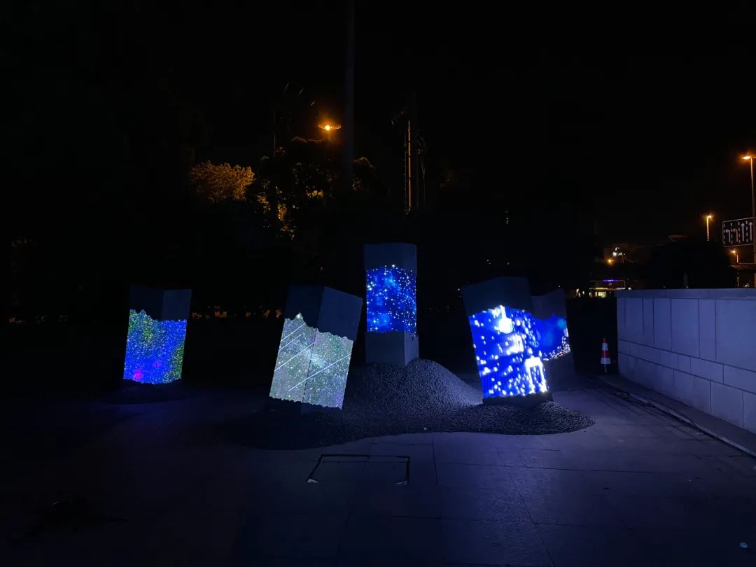 《园·境》:这组微光装置的设计灵感来源于传统的中国园林山水画和现代建筑艺术。我们将水泥柱的断裂效果与青绿山水的长卷画结合在一起,通过LED微光的技术,将画面呈现在屏幕上,以此来营造一个兼具传统与现代、美学与科技的艺术空间。[详情]